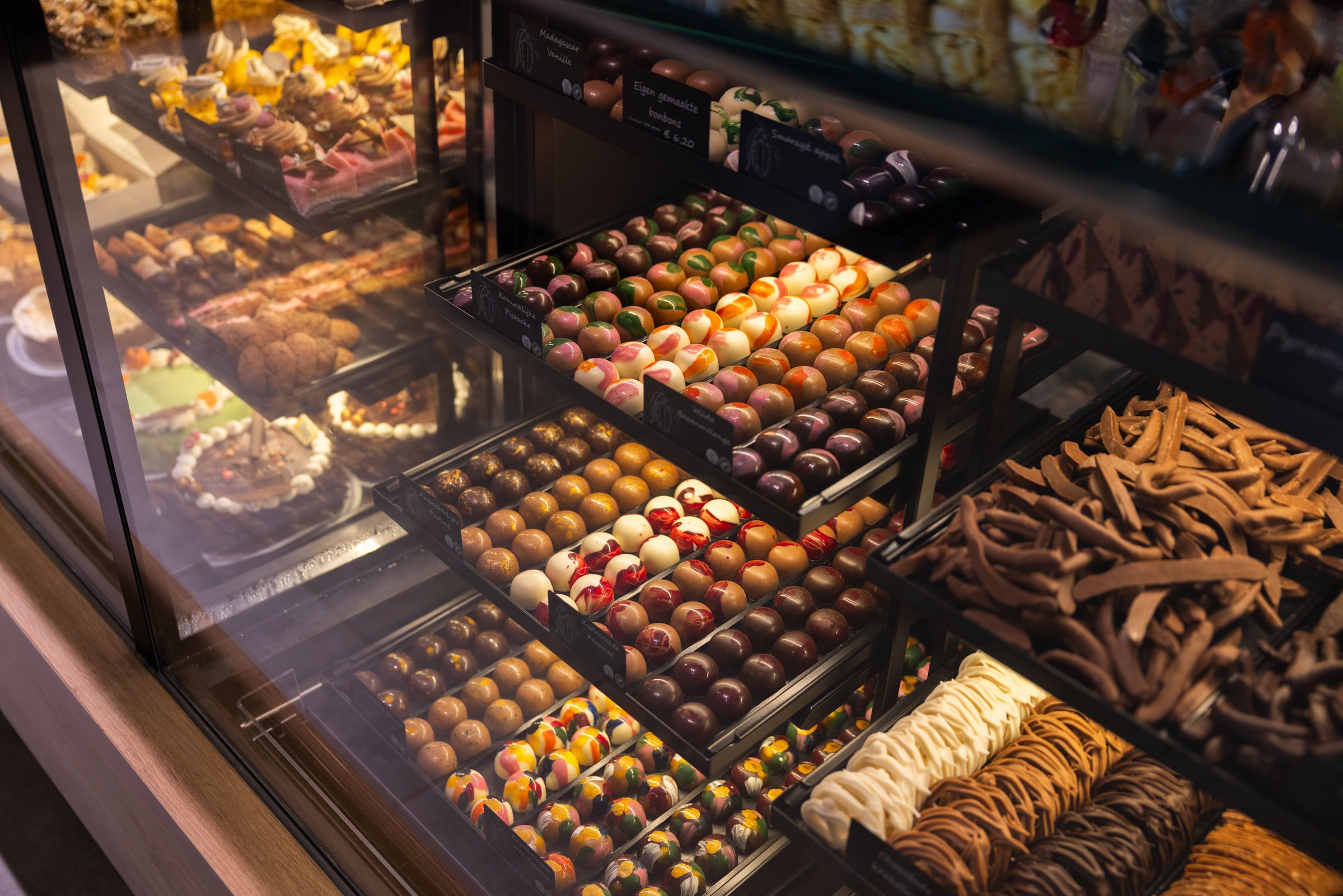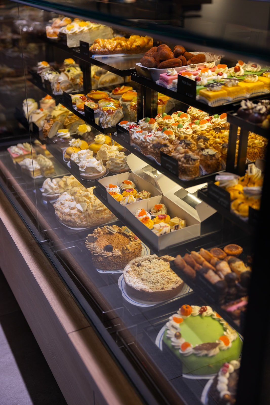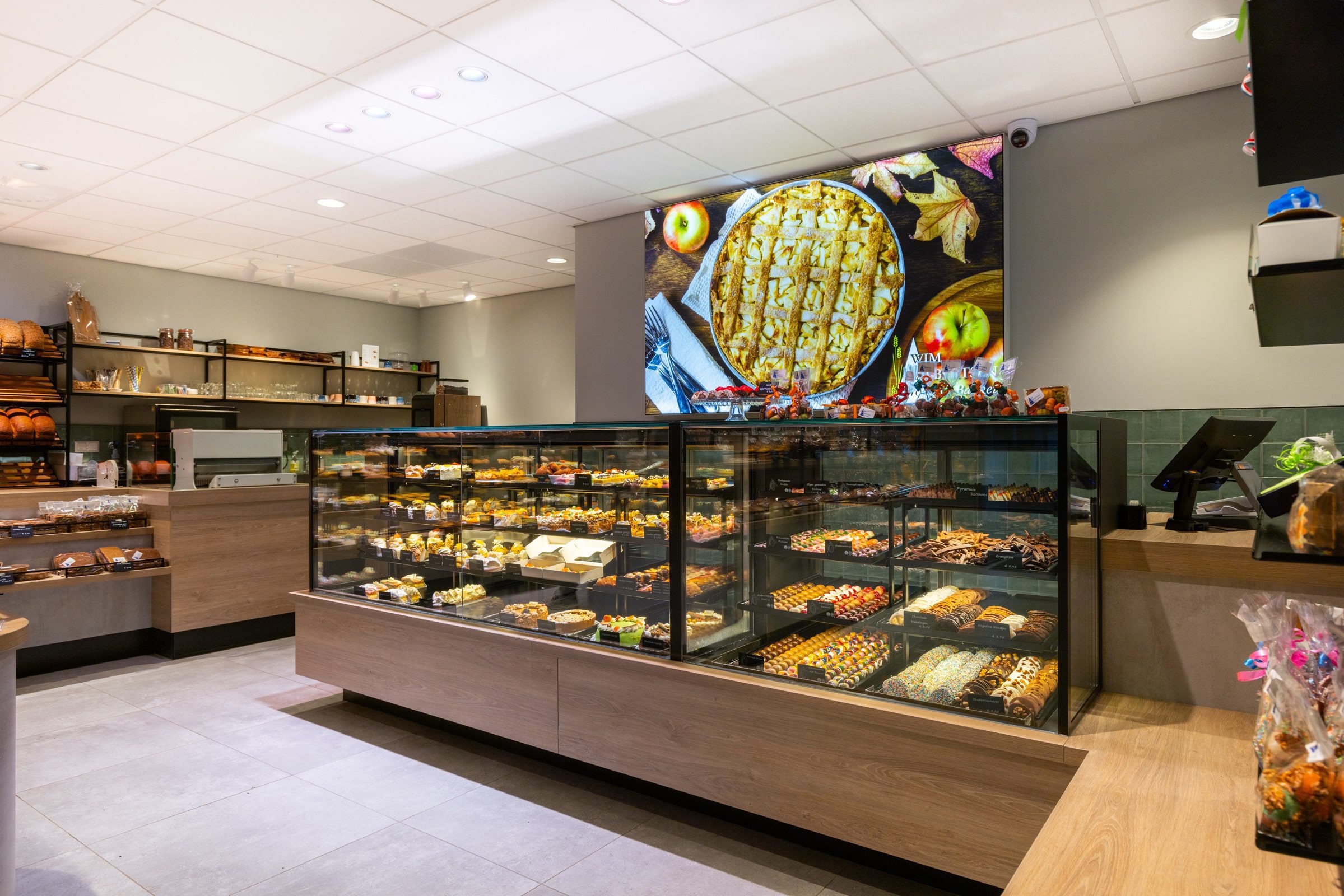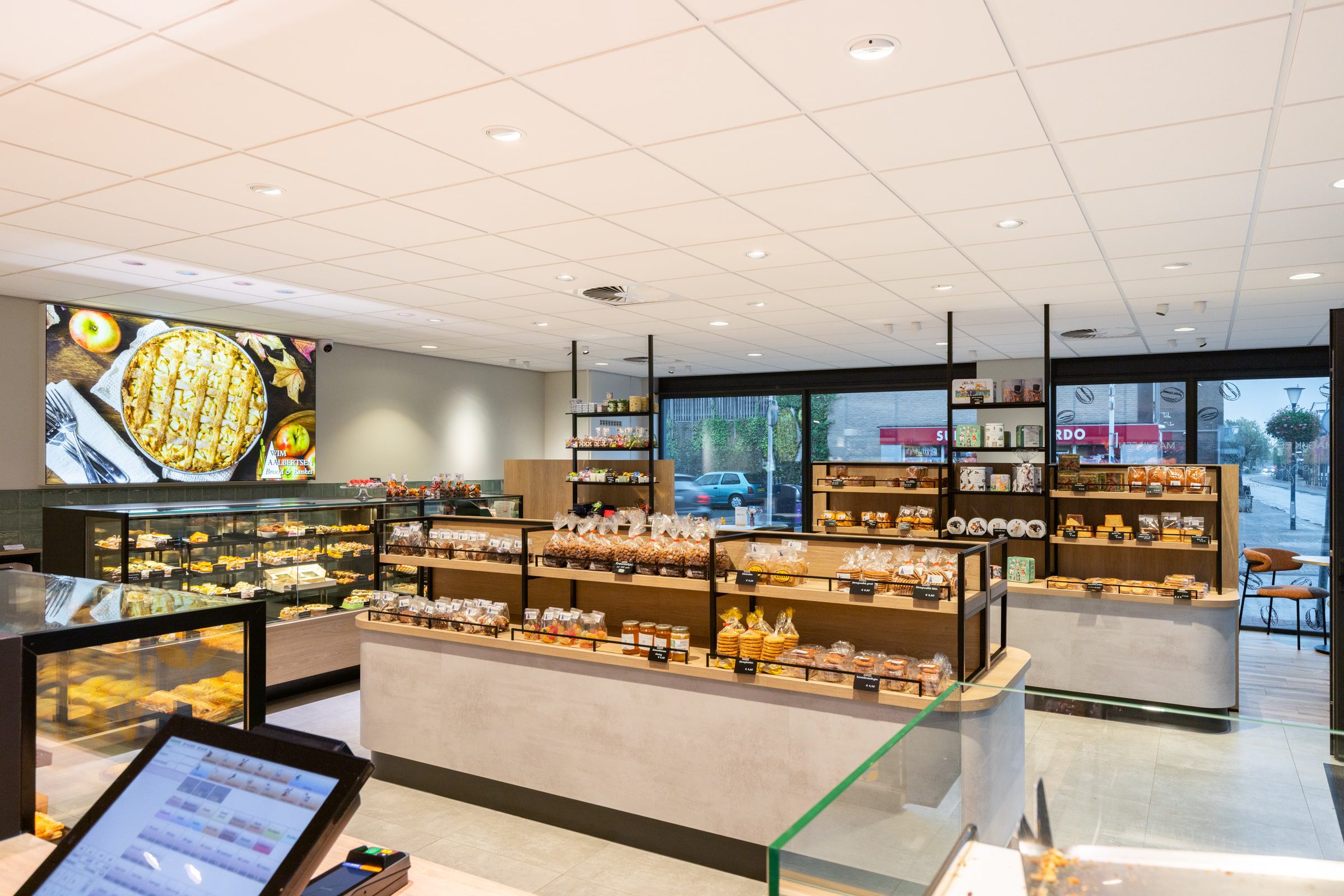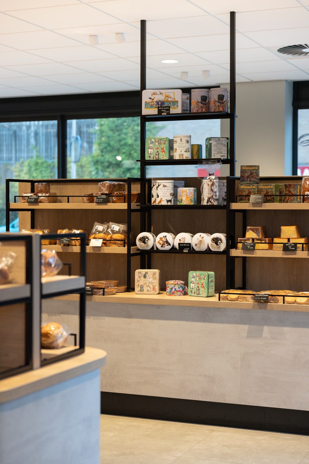 De winkel is voorzien van een lucide gebaksvitrine, die niet alleen de producten perfect presenteert, maar ook zorgt voor een hoge attentiewaarde van het assortiment. Diverse (zelf)bedieningsmeubels bieden klanten gemak en overzicht, terwijl het eilandmeubel een duidelijke routing creëert en de bezoekersstroom soepel begeleidt.