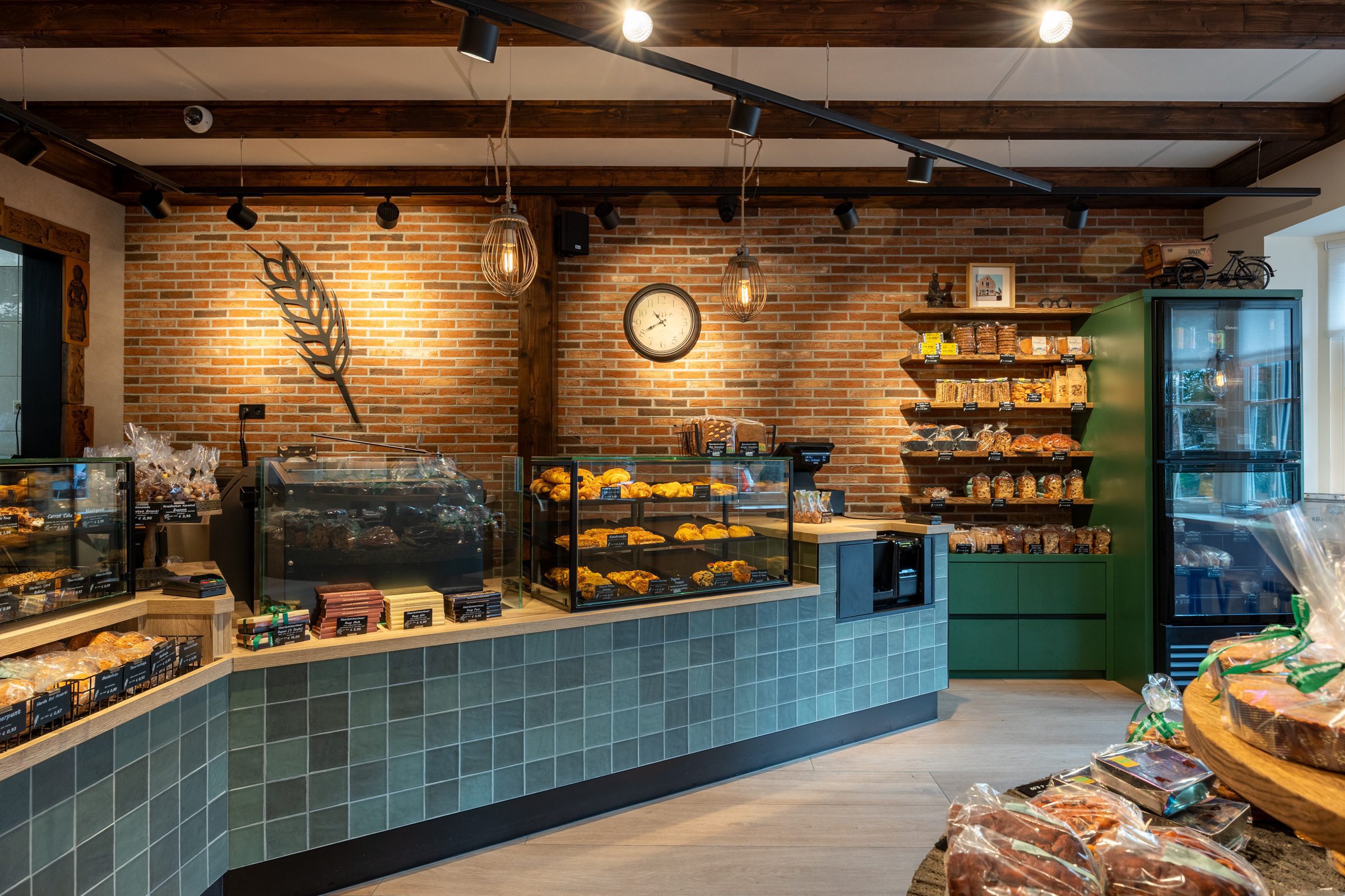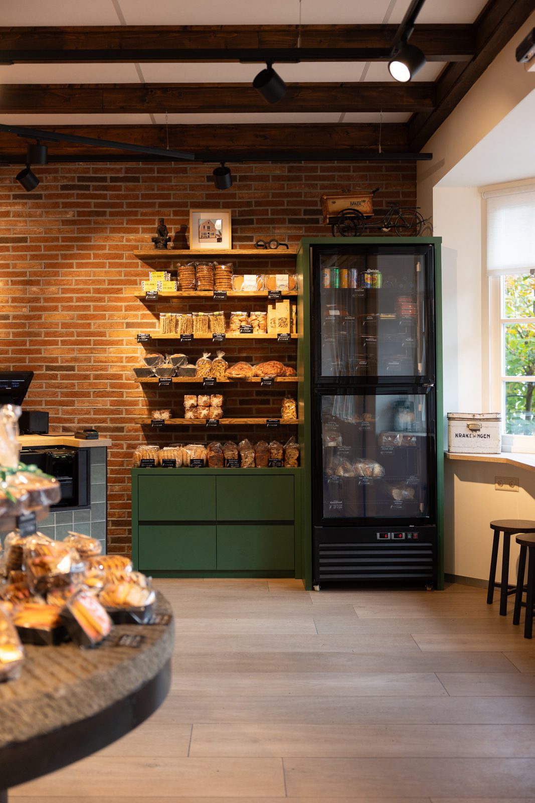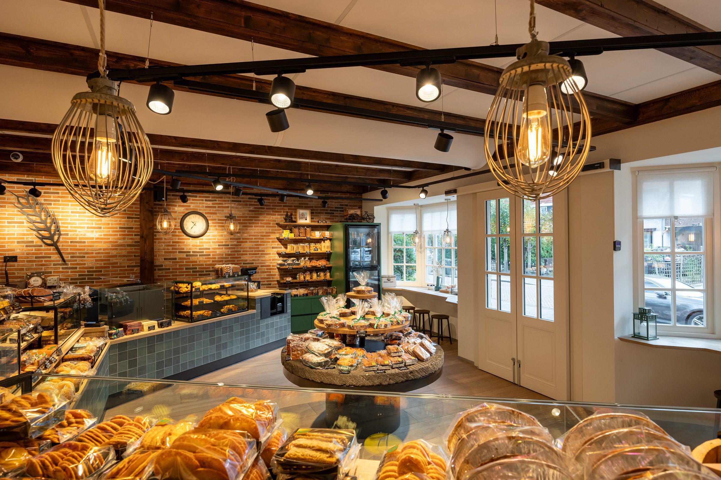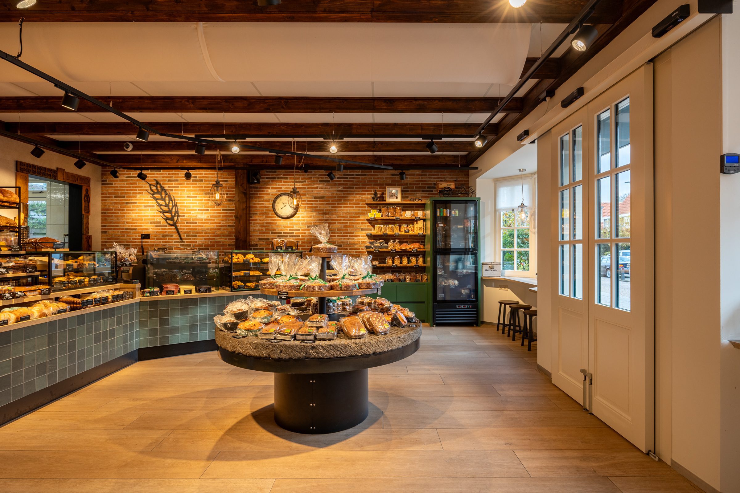 De zware, traditionele winkeldeur is vervangen door twee soepel lopende halve deuren, en een doorkijkje naar de inpakruimte geeft klanten een blik achter de schermen. Dankzij het ontwerp van Martine Amama Interieurstyling en de uitvoering door Emondt is de winkel nu zowel modern als functioneel, met behoud van het karakter en de gezelligheid van de ambachtelijke dorpsbakkerij.