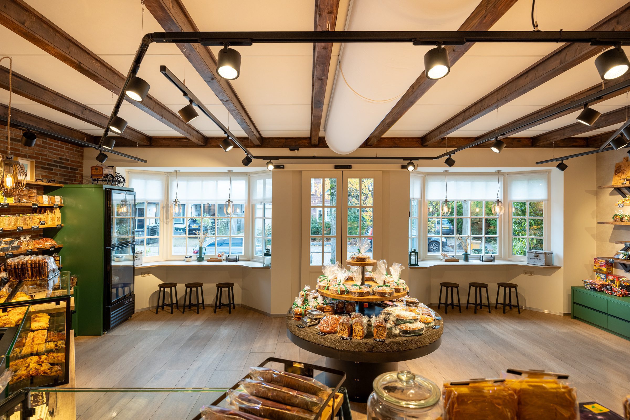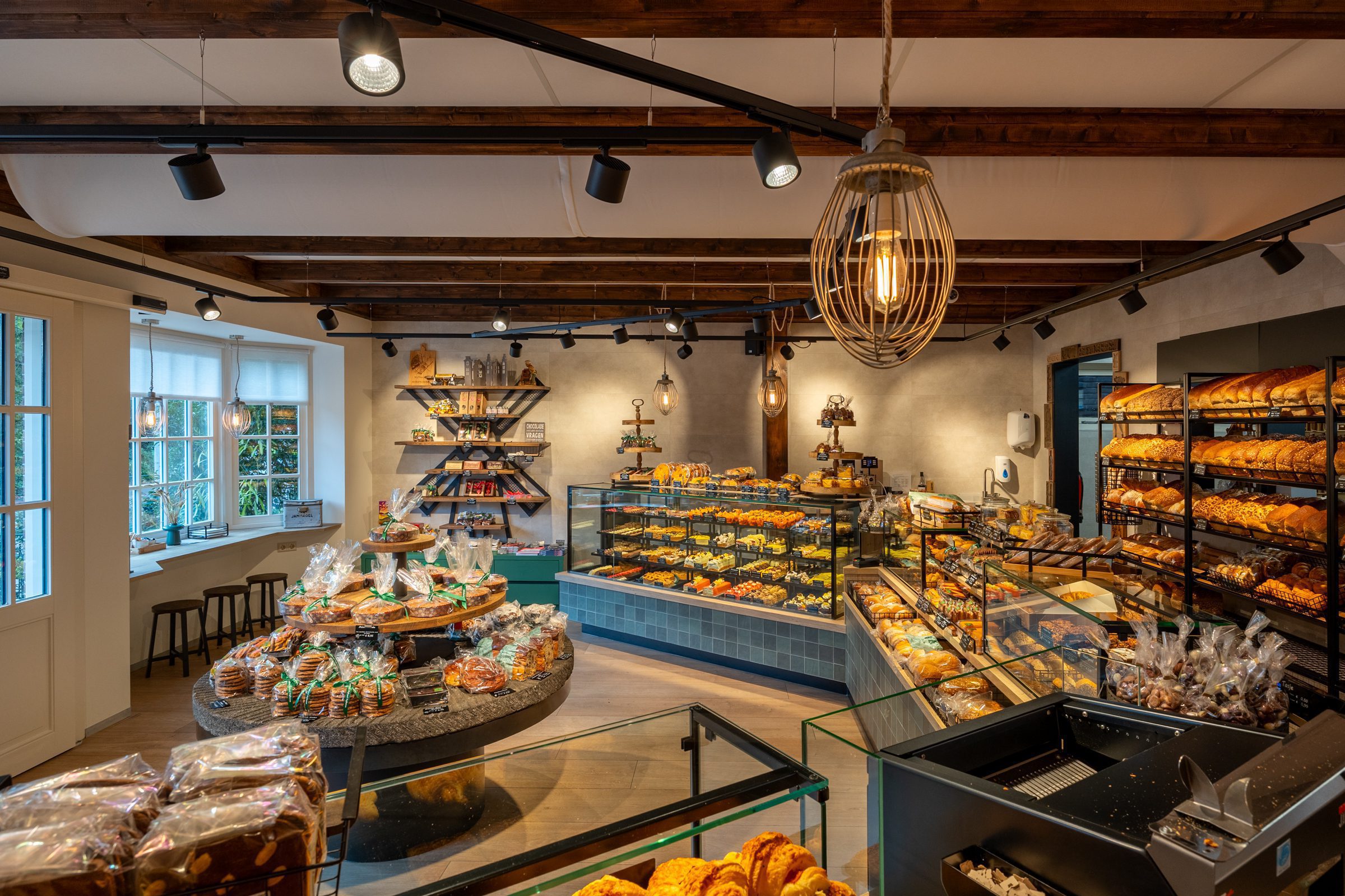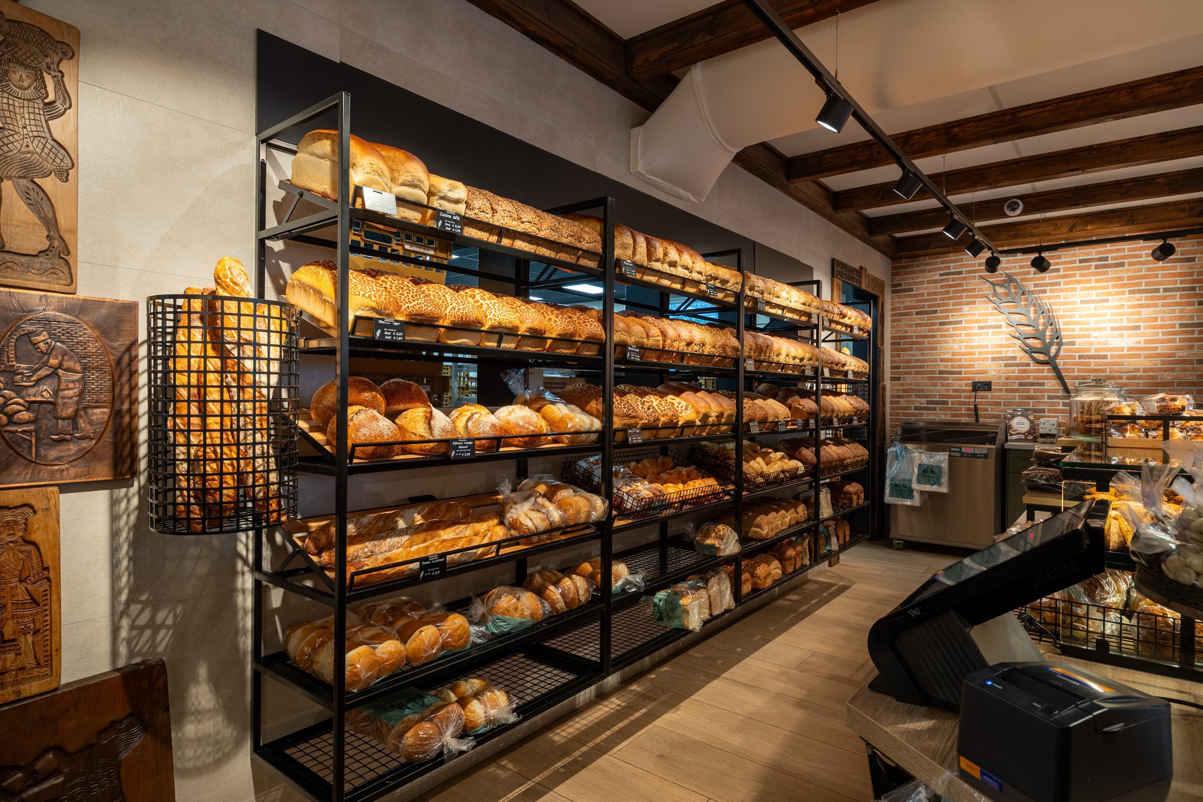 De zware, traditionele winkeldeur is vervangen door twee soepel lopende halve deuren, en een doorkijkje naar de inpakruimte geeft klanten een blik achter de schermen. Dankzij het ontwerp van Martine Amama Interieurstyling en de uitvoering door Emondt is de winkel nu zowel modern als functioneel, met behoud van het karakter en de gezelligheid van de ambachtelijke dorpsbakkerij.