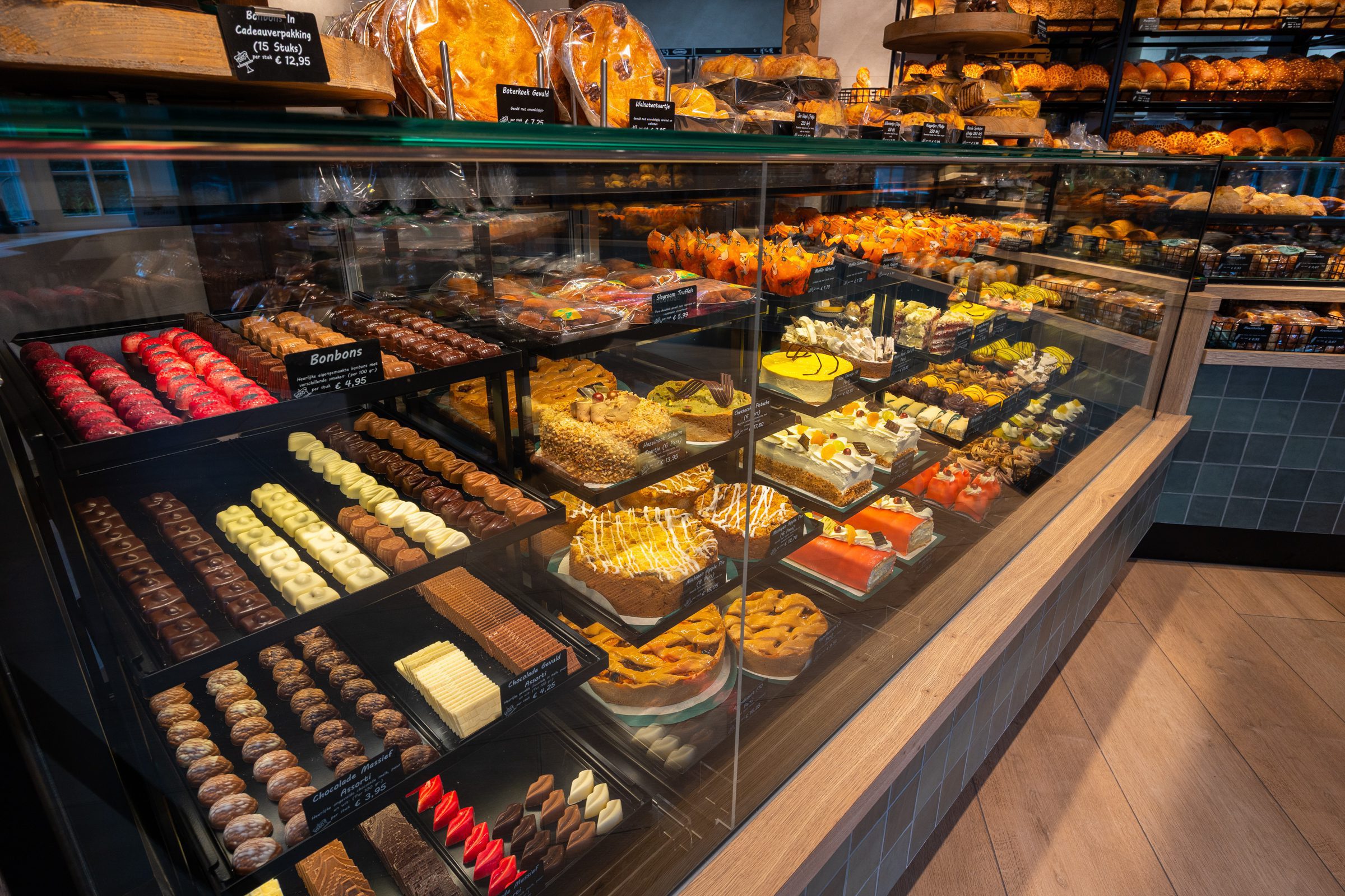 Het interieur – volledig ontworpen door Martine Amama Interieurstyling – is in de breedte ingericht, waardoor de winkel een gevoel van ruimte en licht krijgt. Het centrale element is de nieuwe toonbank, die samen met de op maat gemaakte presentatiemeubels het assortiment aan brood, gebak en lekkernijen overzichtelijk en uitnodigend presenteert. Emondt heeft het ontwerp tot leven gebracht met hoogwaardige interieurbouw en zorg voor afwerking.