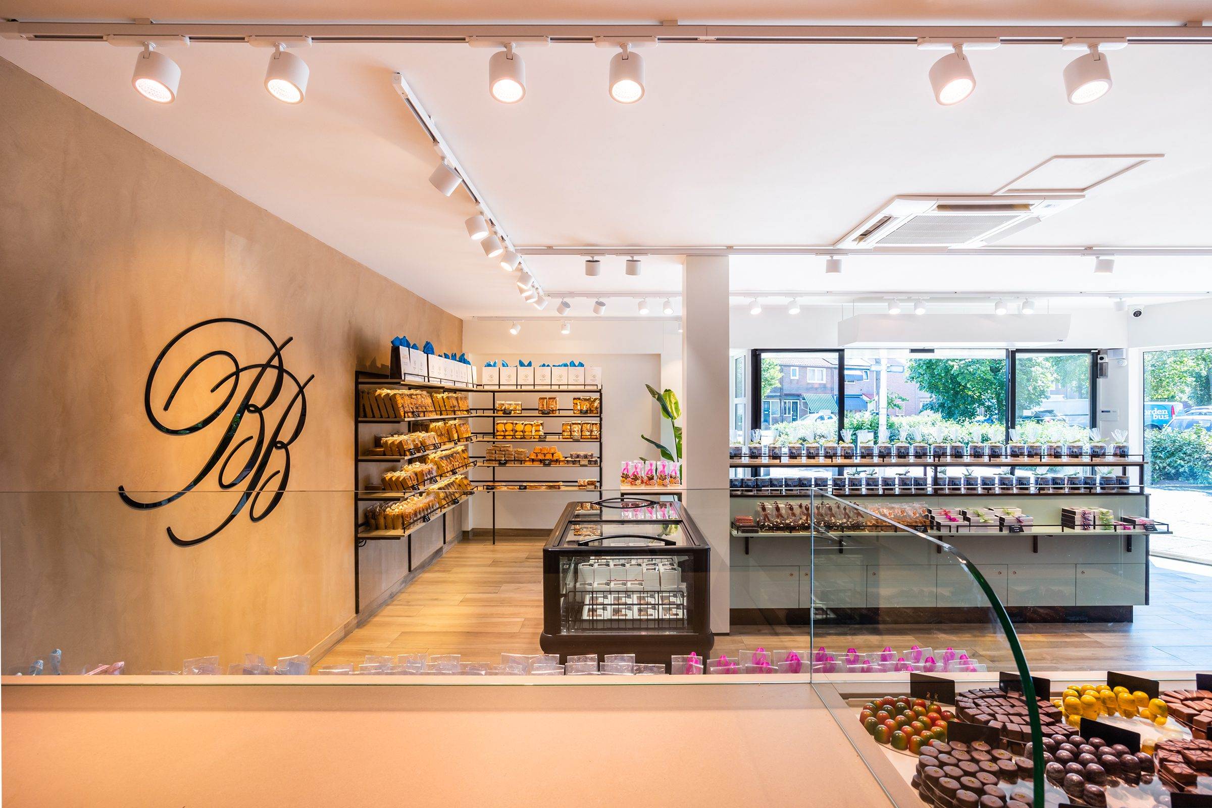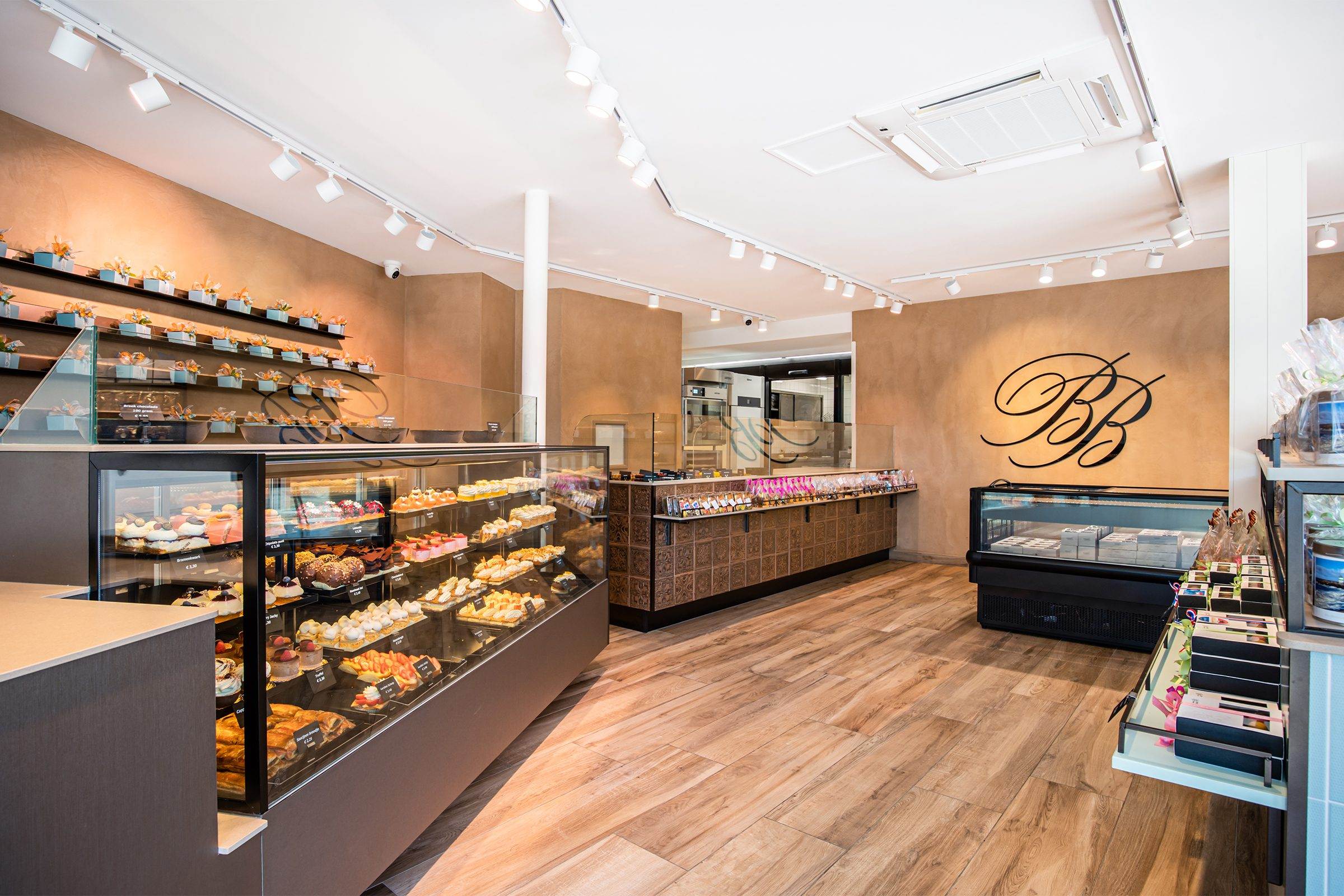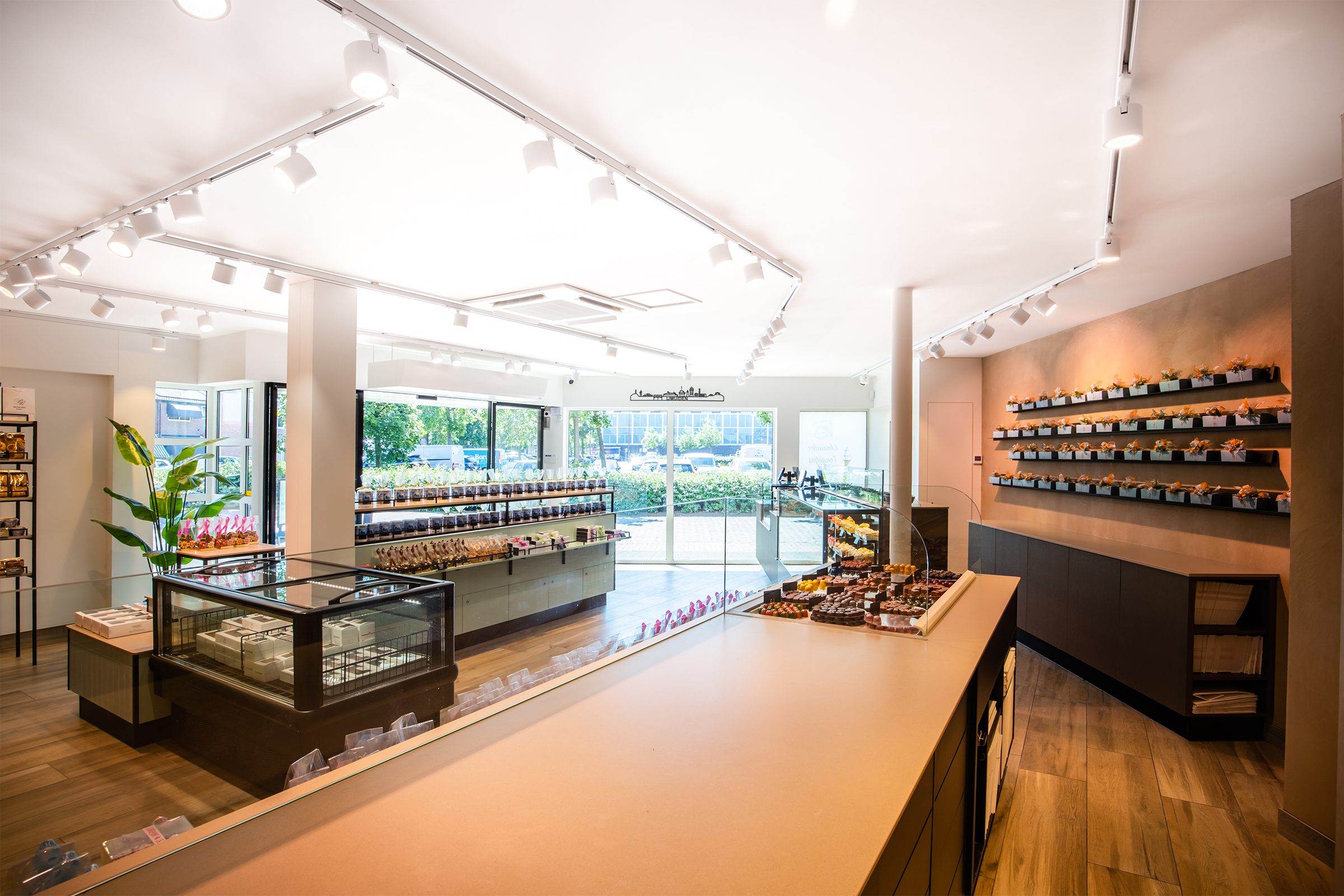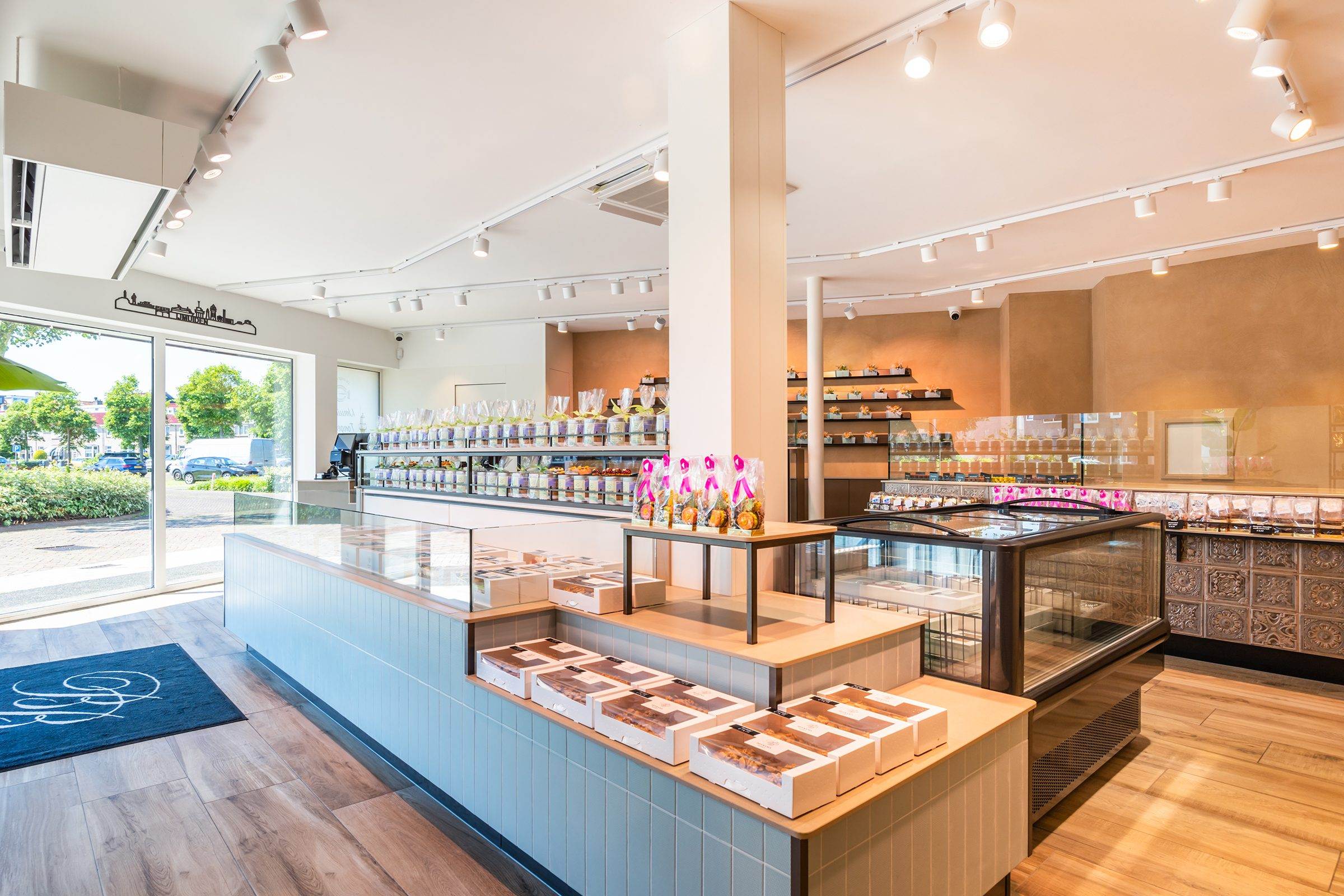 Bij binnenkomst wordt de klant direct naar het koeleiland geleid, om vervolgens langs de zelfbedieningswand, bonbonpresentatie en gebaksvitrine naar de kassa te lopen. Deze route is ontworpen om de winkelervaring efficiënt en prettig te maken.