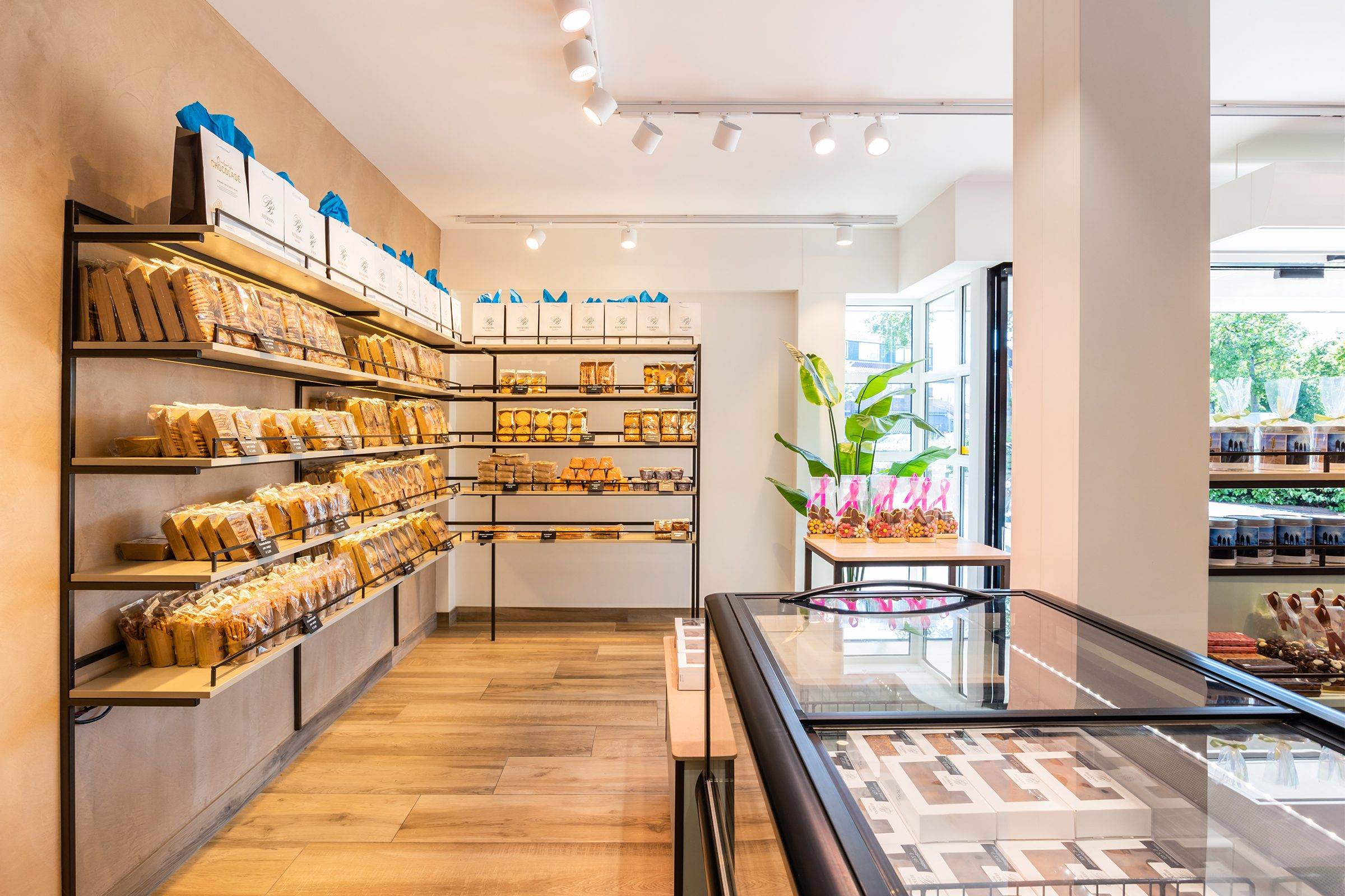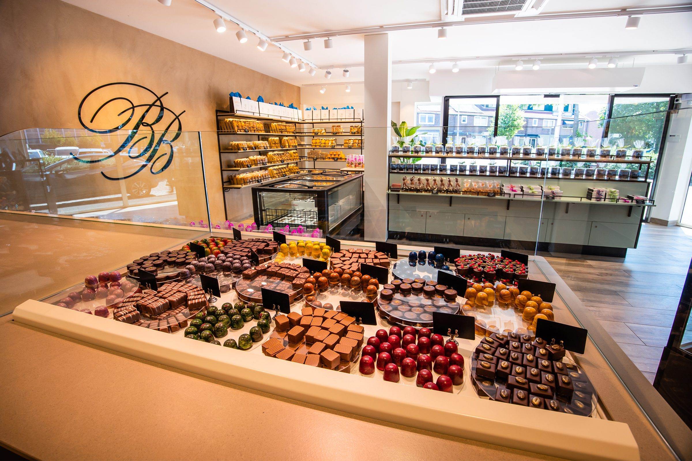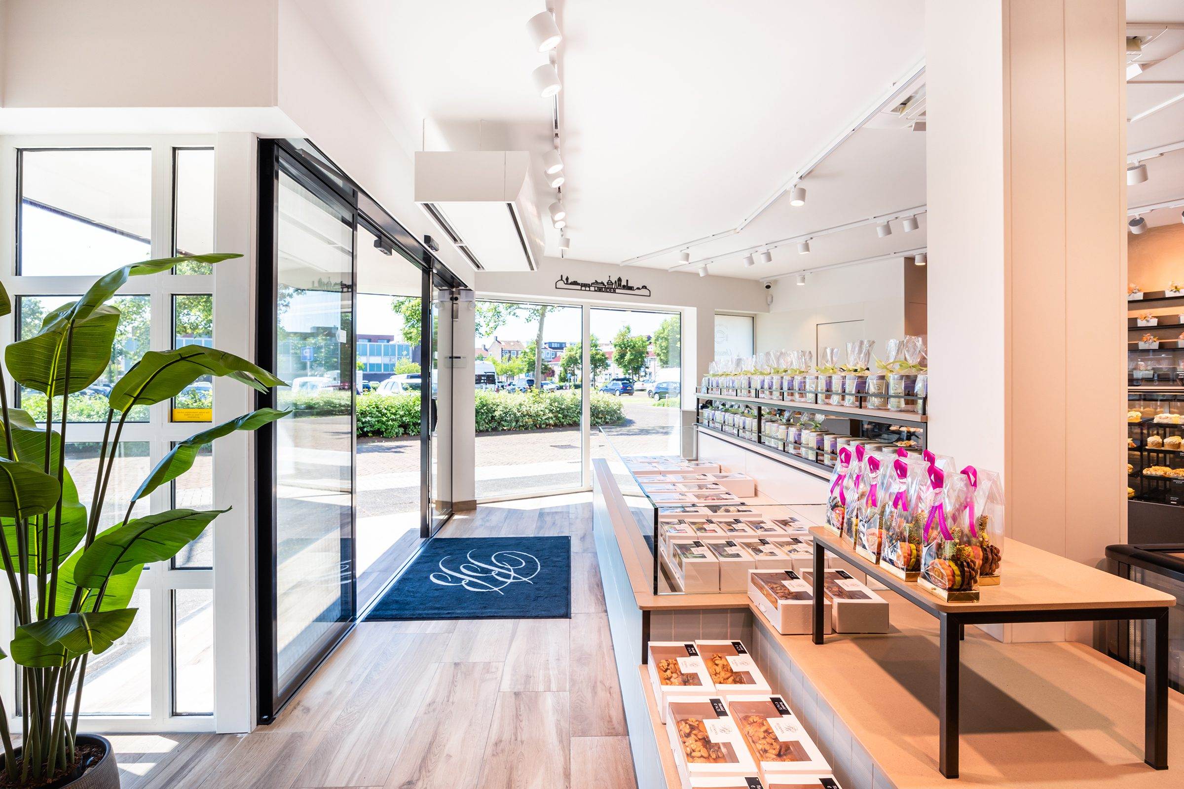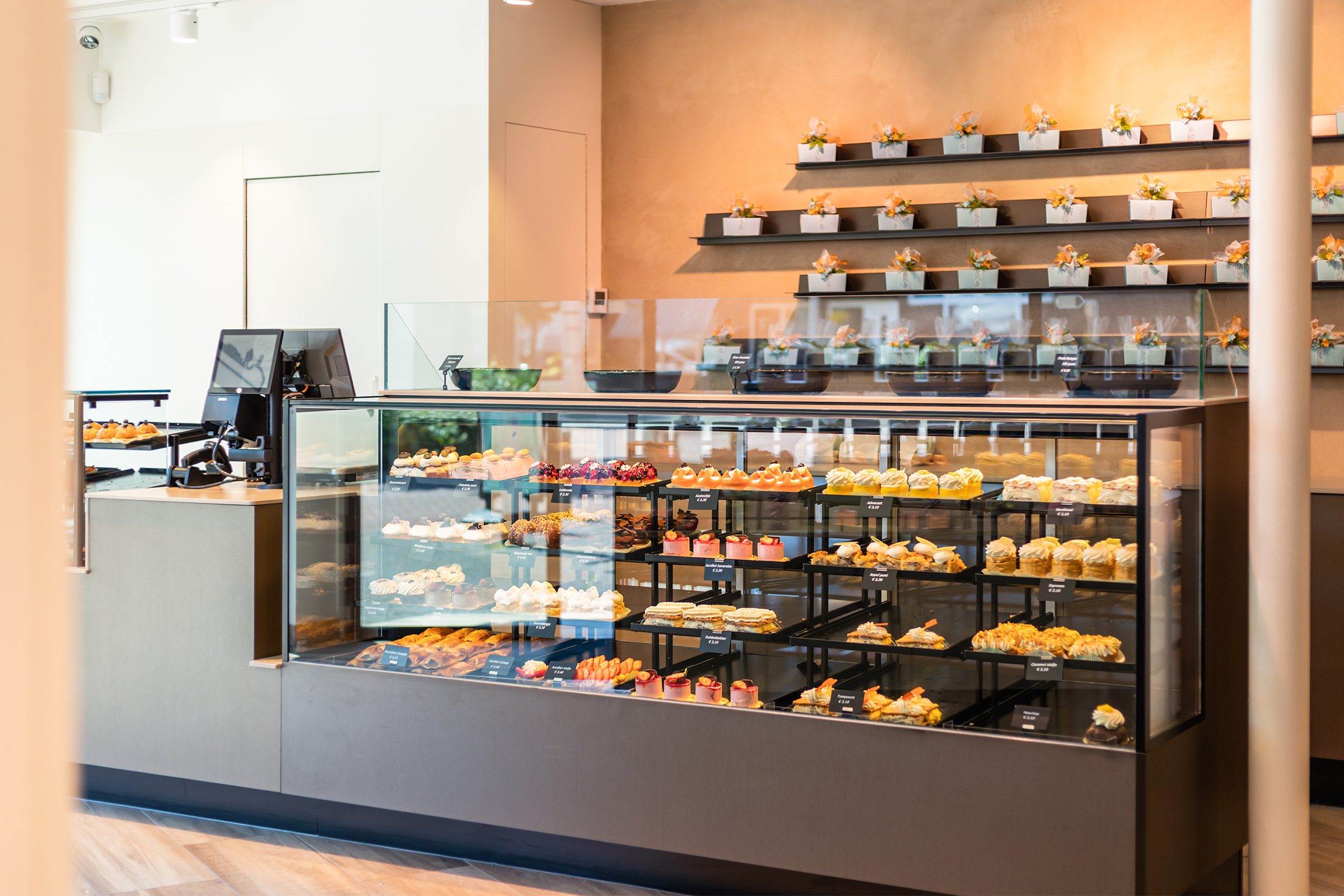 Bij binnenkomst wordt de klant direct naar het koeleiland geleid, om vervolgens langs de zelfbedieningswand, bonbonpresentatie en gebaksvitrine naar de kassa te lopen. Deze route is ontworpen om de winkelervaring efficiënt en prettig te maken.