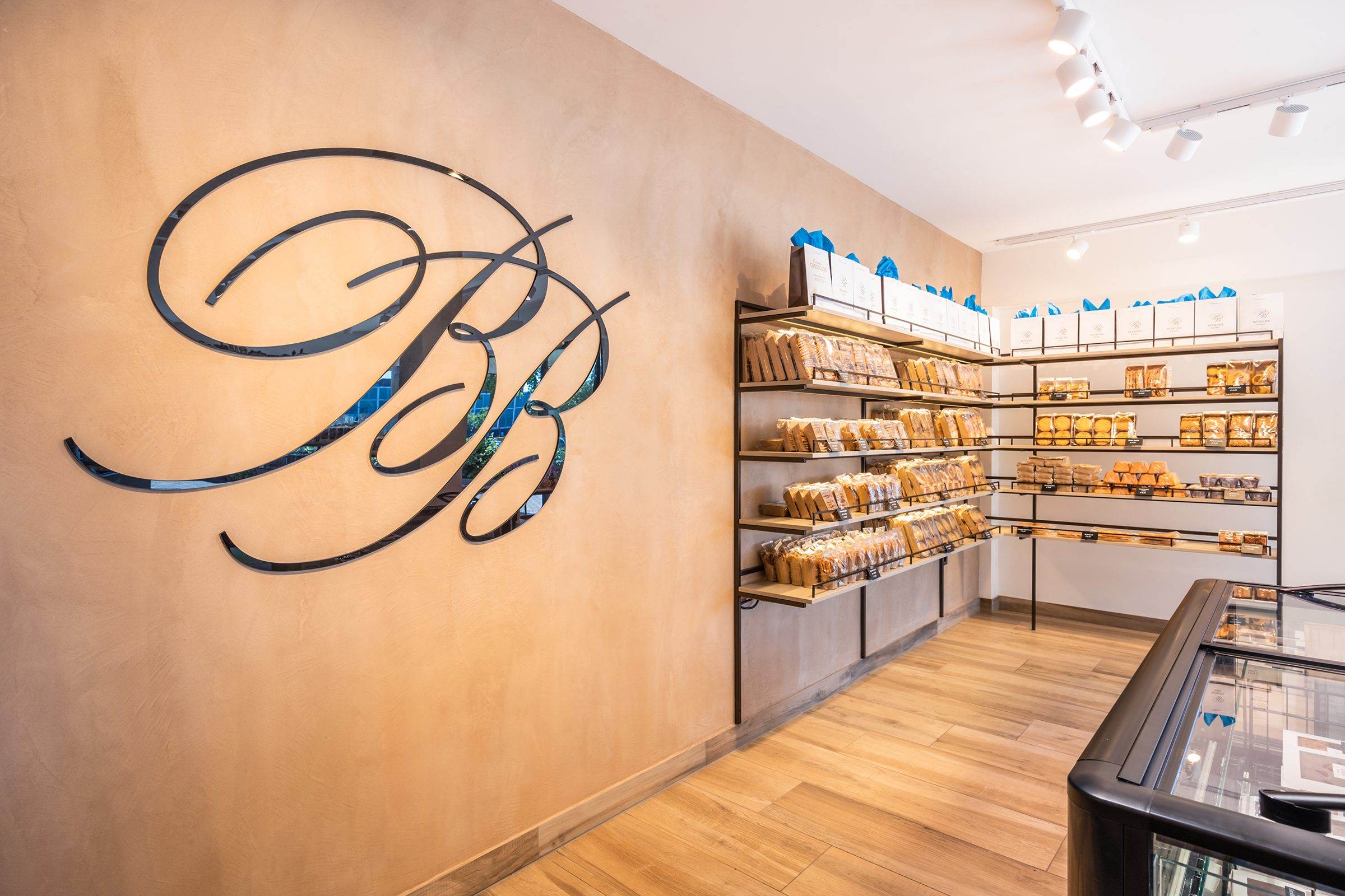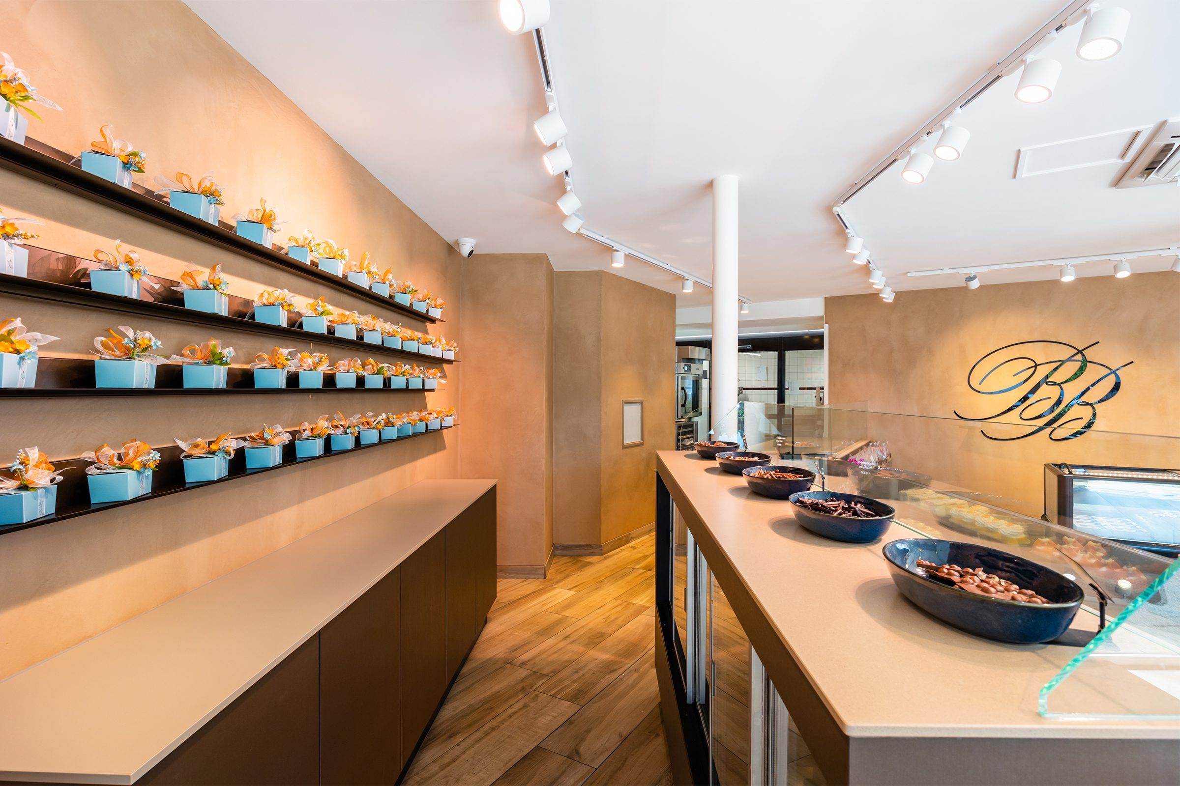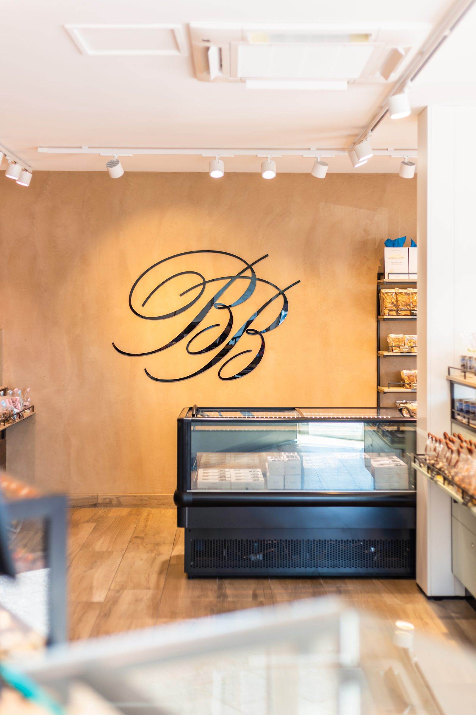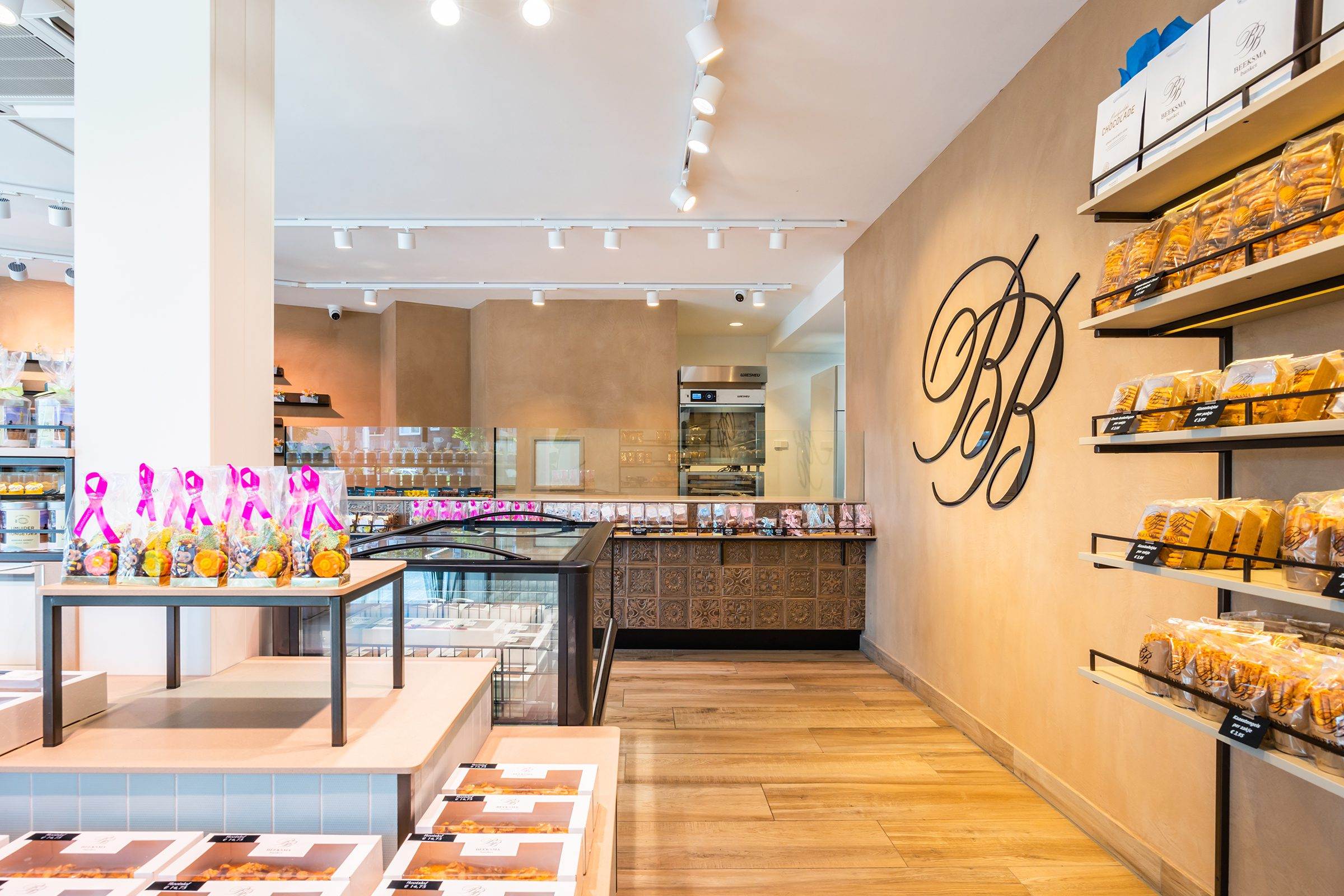 Bij binnenkomst wordt de klant direct naar het koeleiland geleid, om vervolgens langs de zelfbedieningswand, bonbonpresentatie en gebaksvitrine naar de kassa te lopen. Deze route is ontworpen om de winkelervaring efficiënt en prettig te maken.