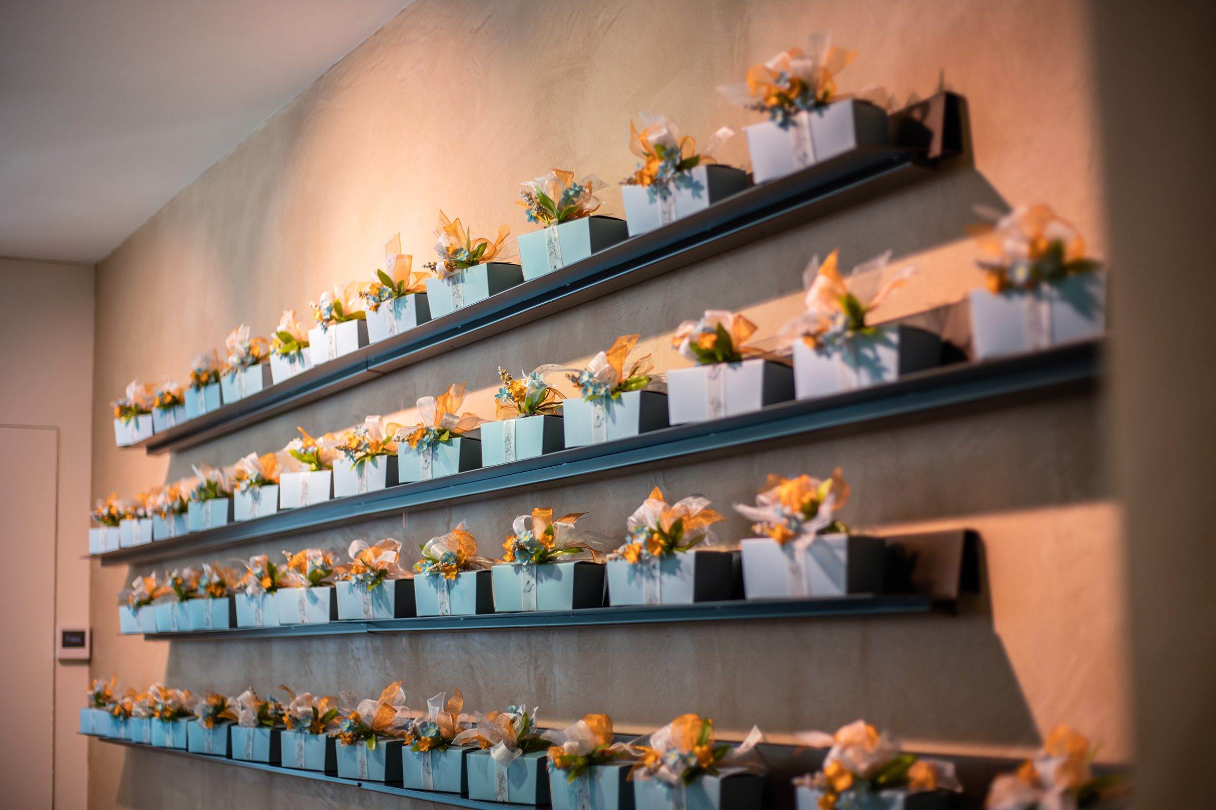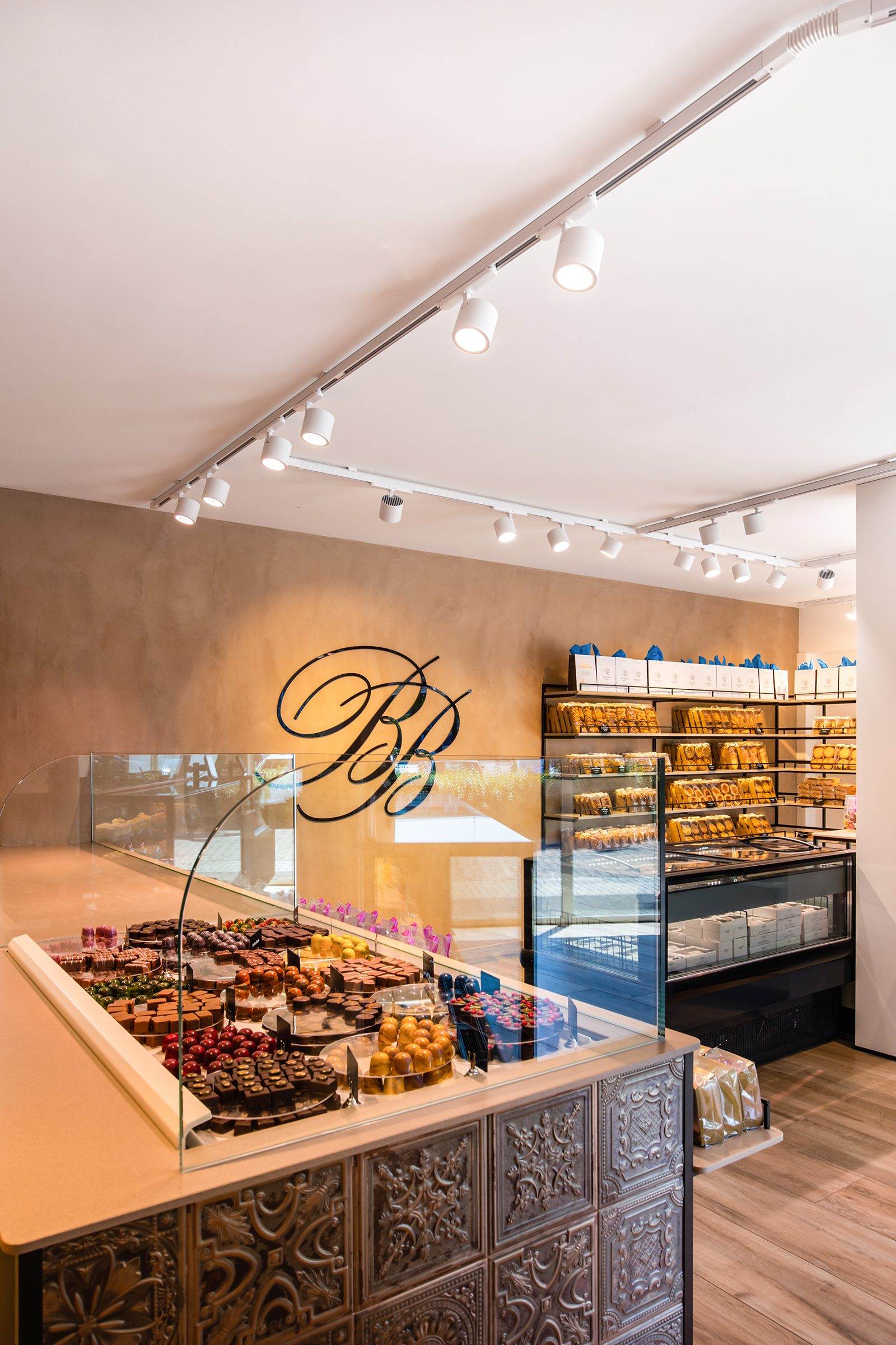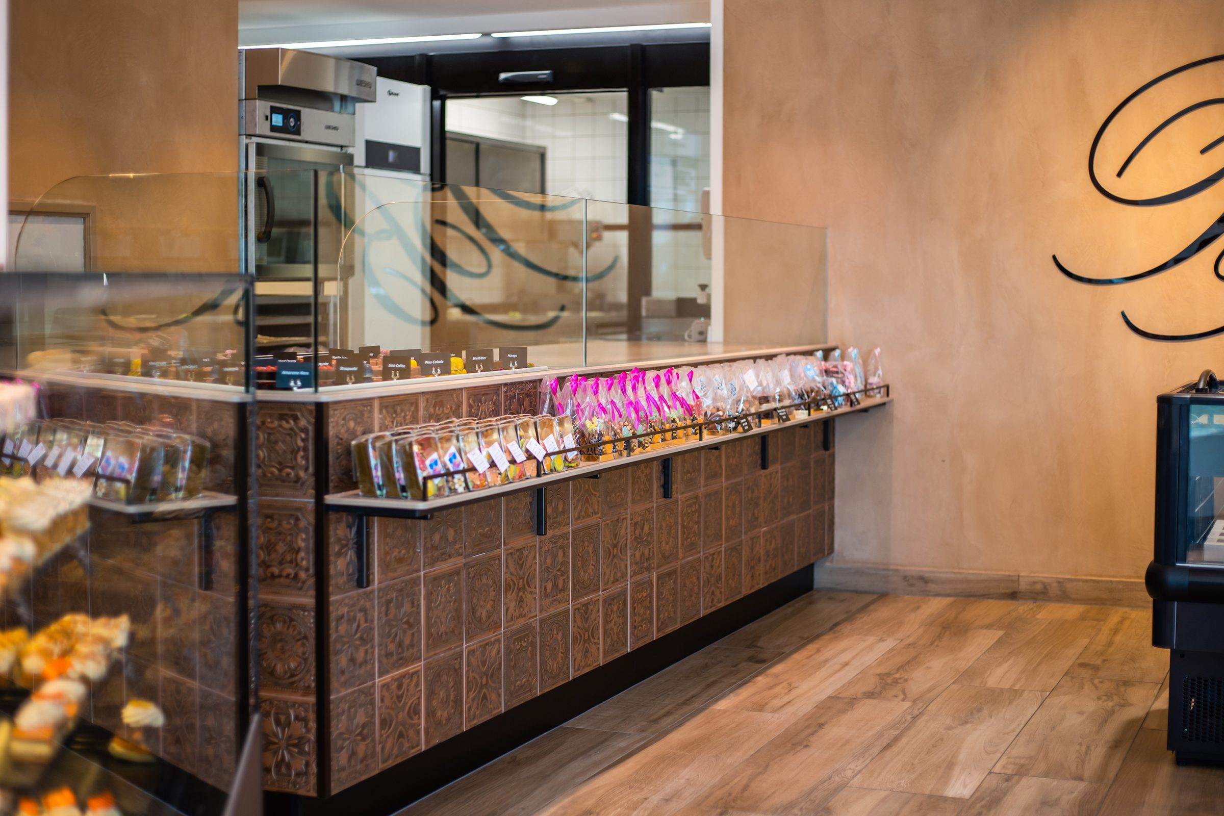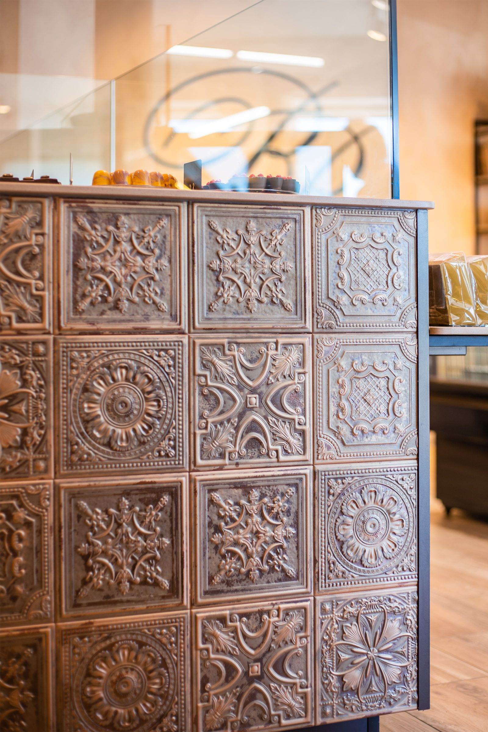 De bonbonpresentatie heeft een stijlvolle ombouw met 3D-wandtegels uit de Gatsby Copper-serie van Aparici. Deze vintage metallic tegels passen perfect bij het industriële interieur van de winkel.