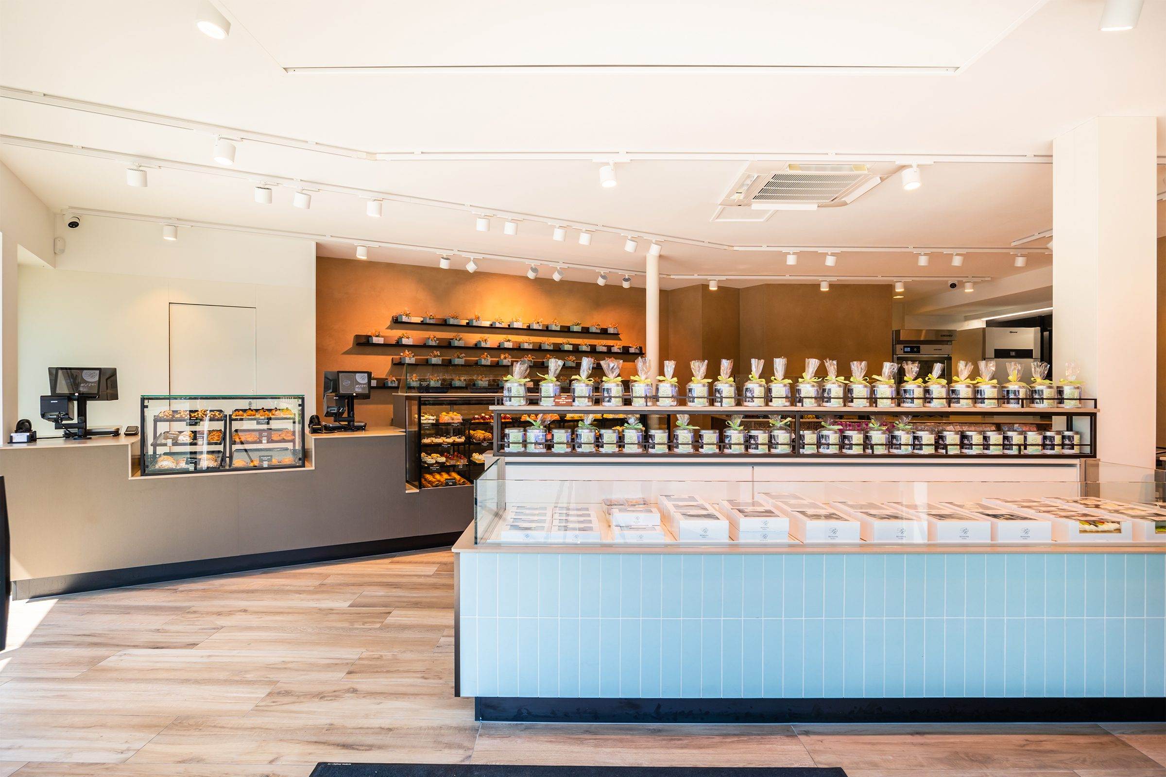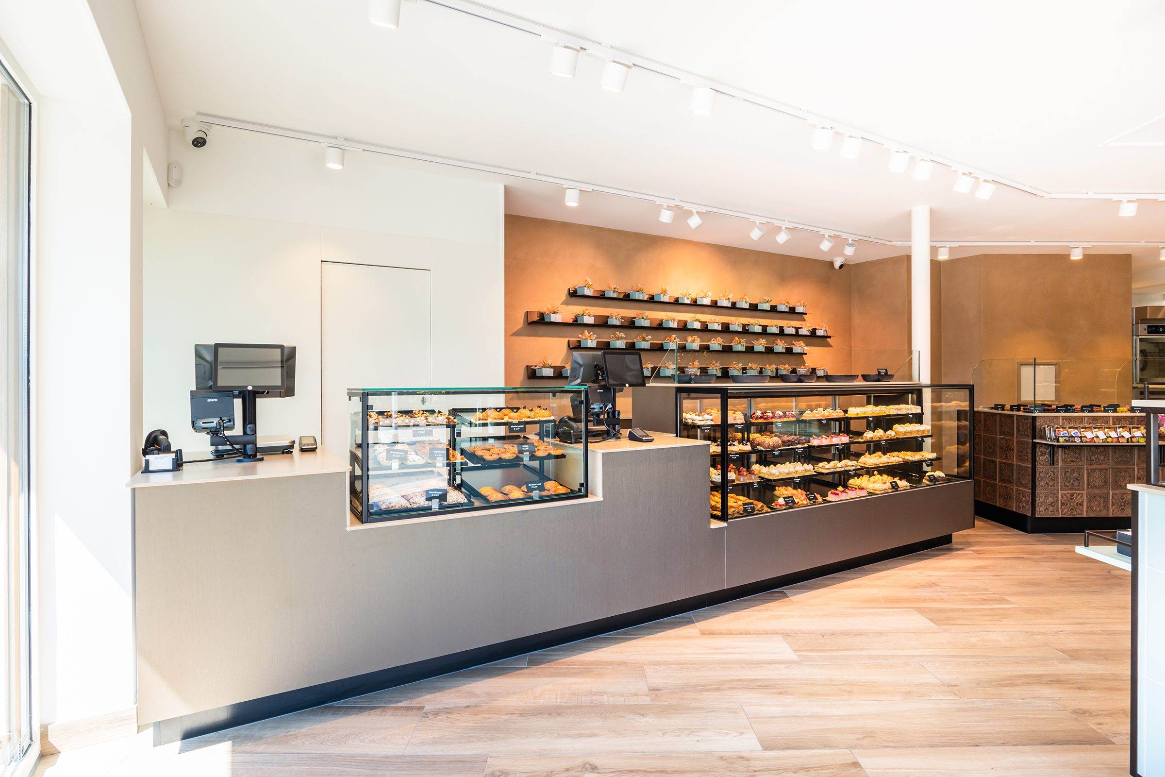 Tussen de kassa’s staat een glasopstand met dynamische verlichting en een luxe ombouw van DecoLegno FA84 Reflex Cleaf, die de ruimte een warme en luxueuze uitstraling geeft. De werkbladen zijn van Diresco en behandeld met BIO-UV hars, gemaakt van hernieuwbare materialen. De Velvet-afwerking zorgt voor een matte, fluweelzachte oppervlakte die onderhoudsvriendelijk is en bestand tegen zonlicht.