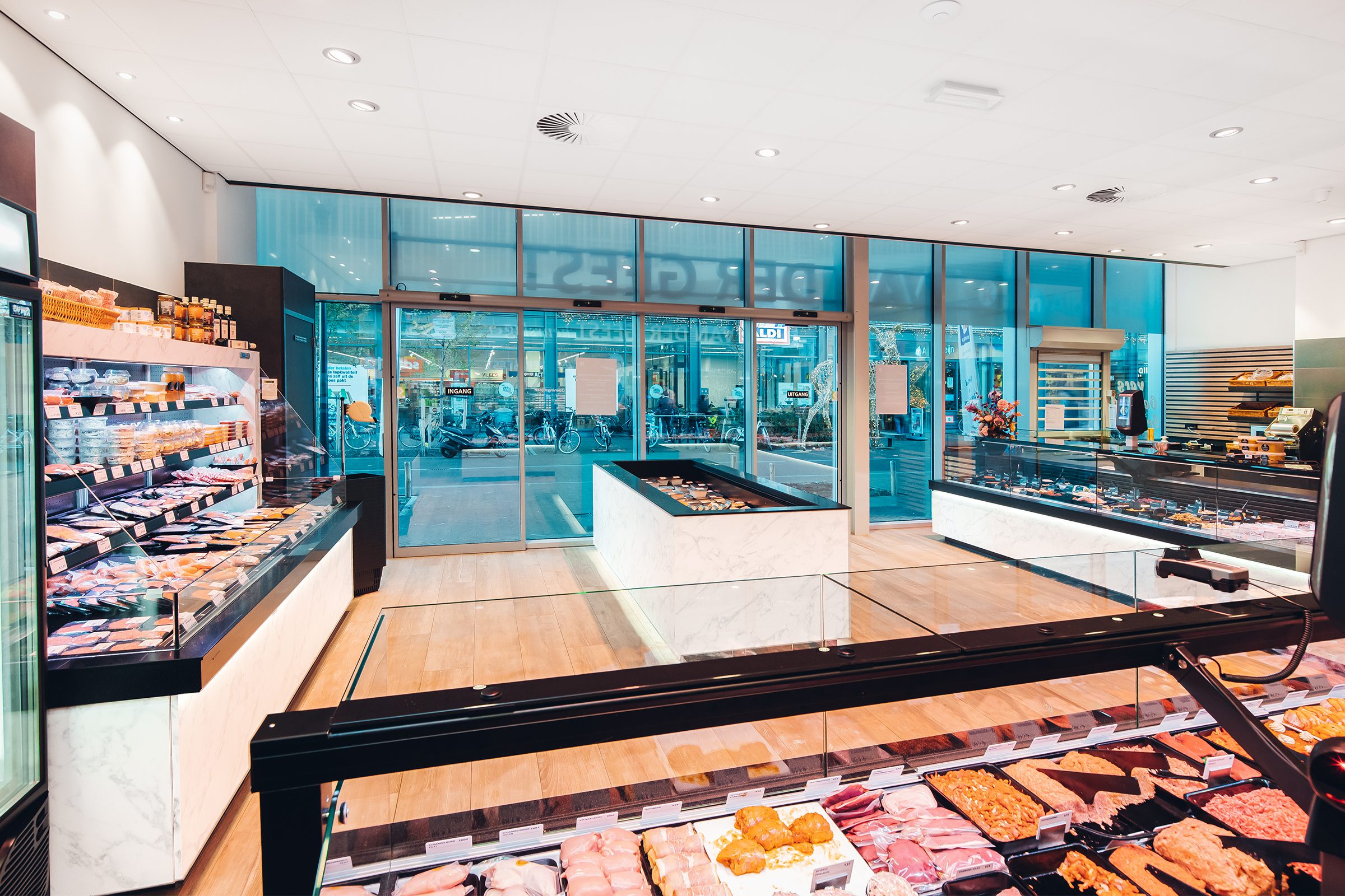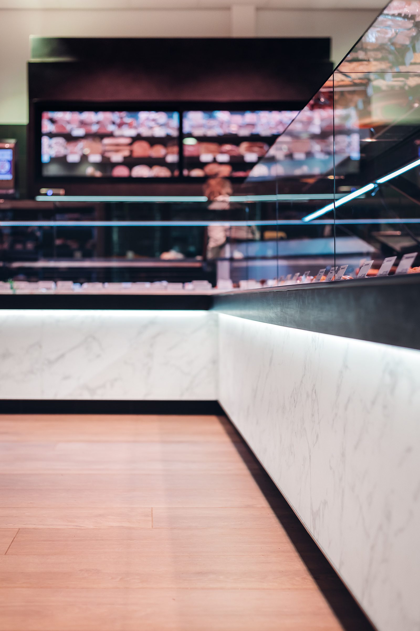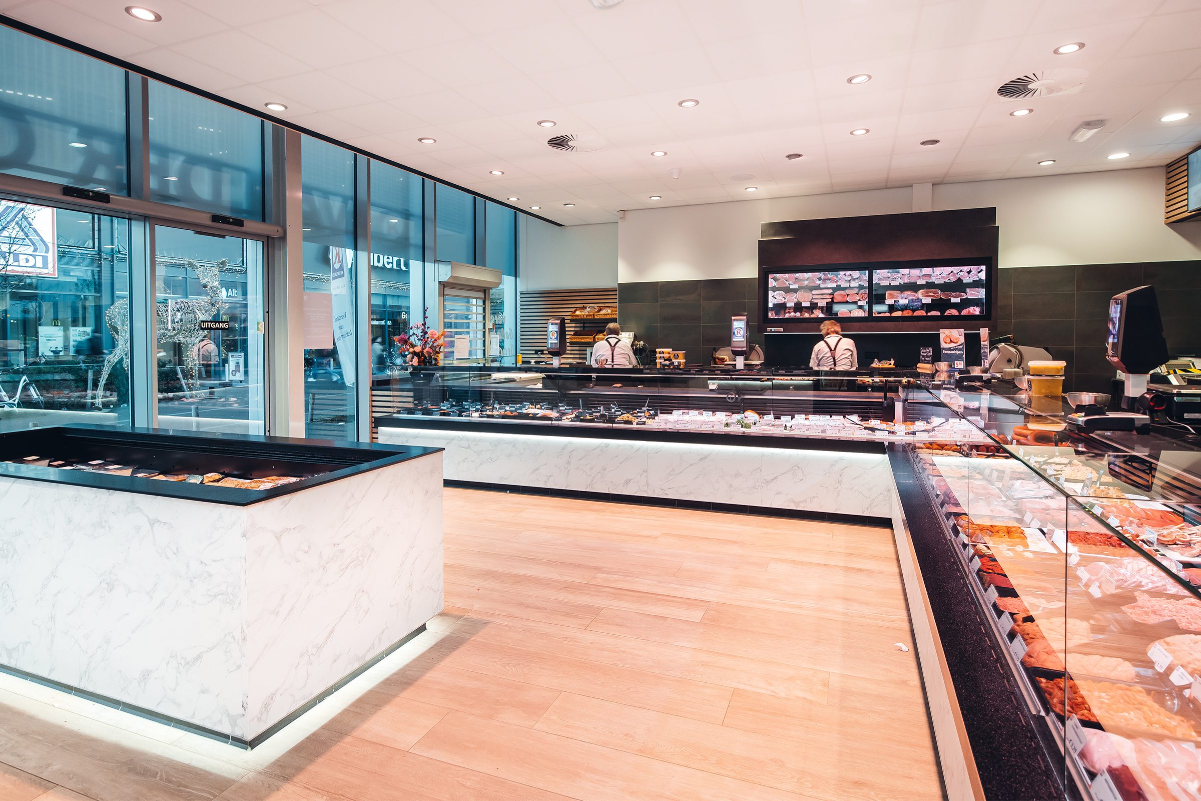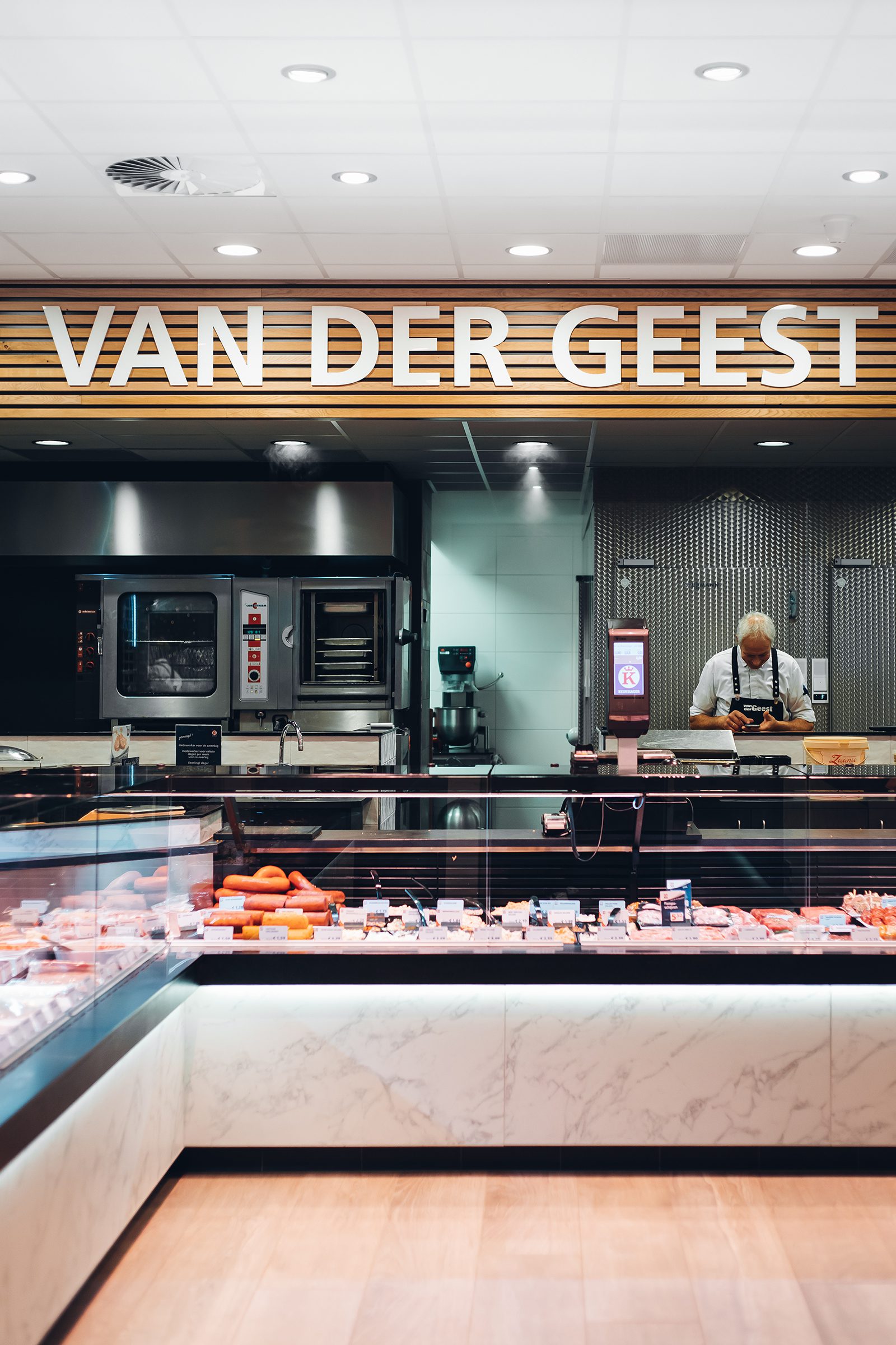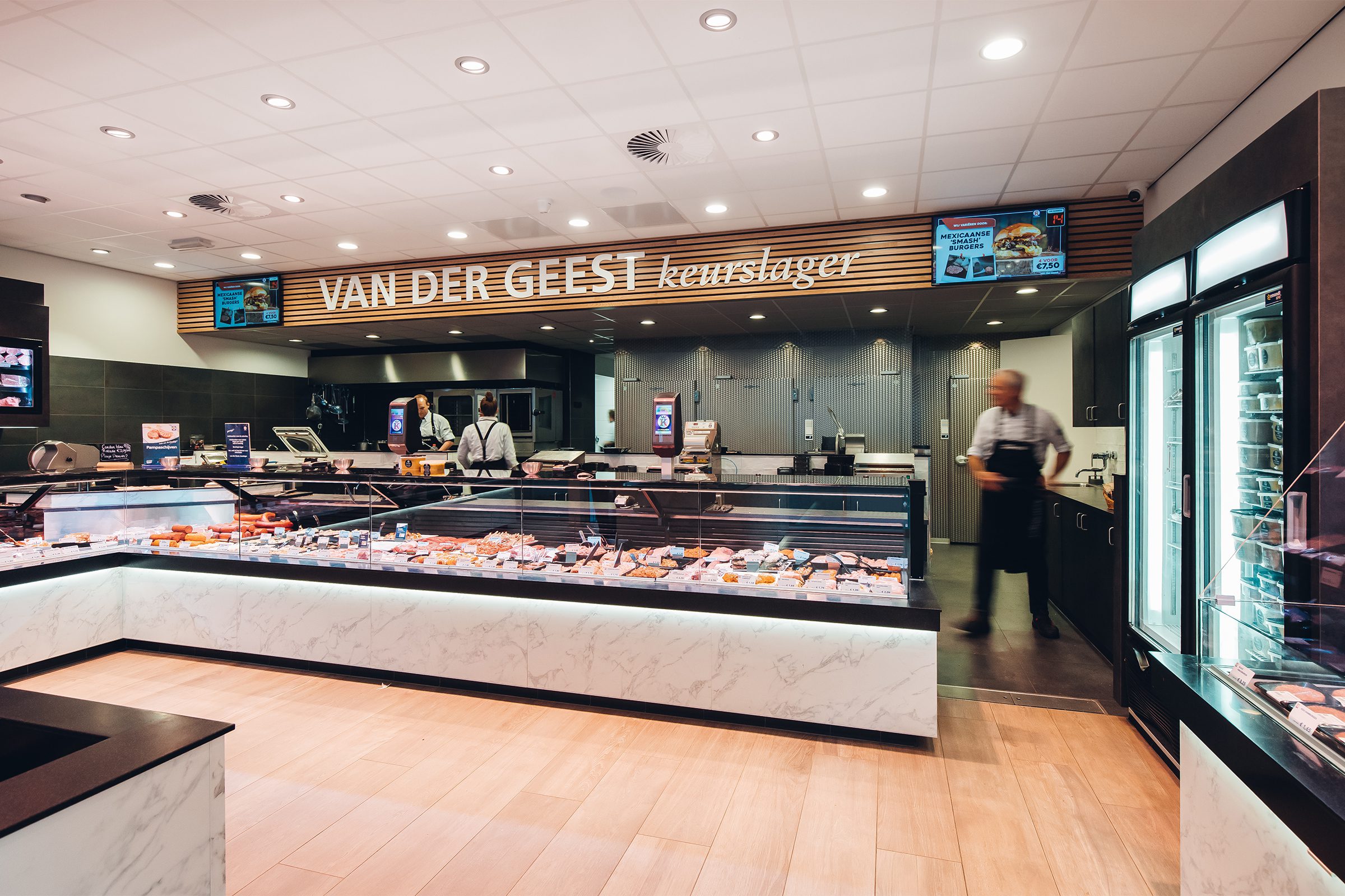 The new store of Keurslagerij van der Geest in Haarlem has a rather sleek design concept. The white marble look creates a luxurious look with an industrial vibe through the combination of wood and black tones.
