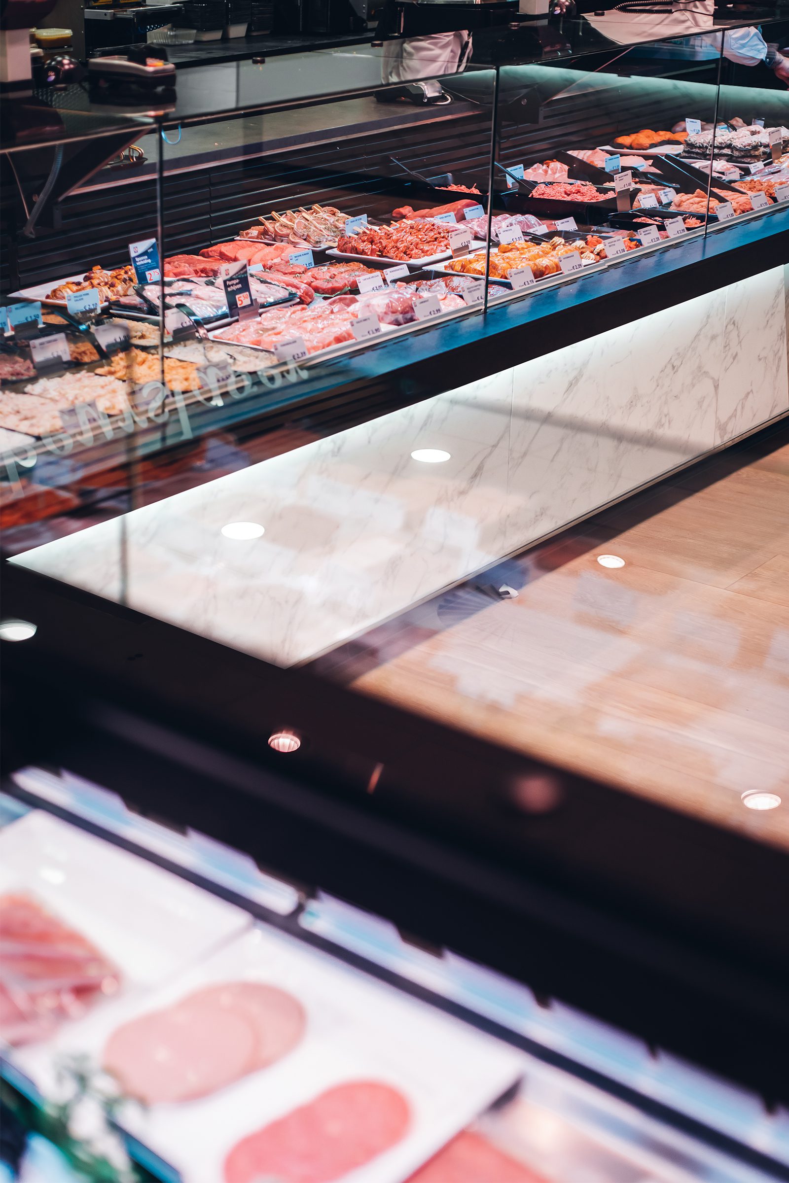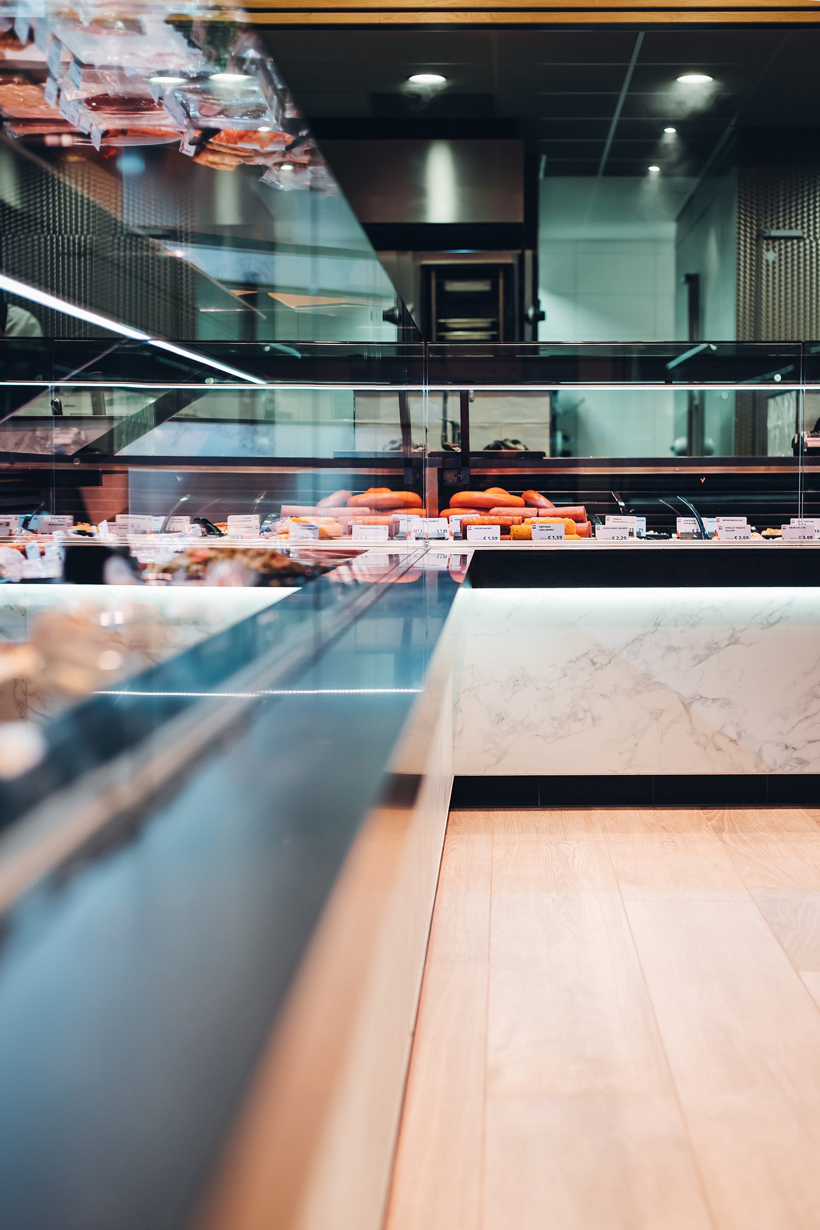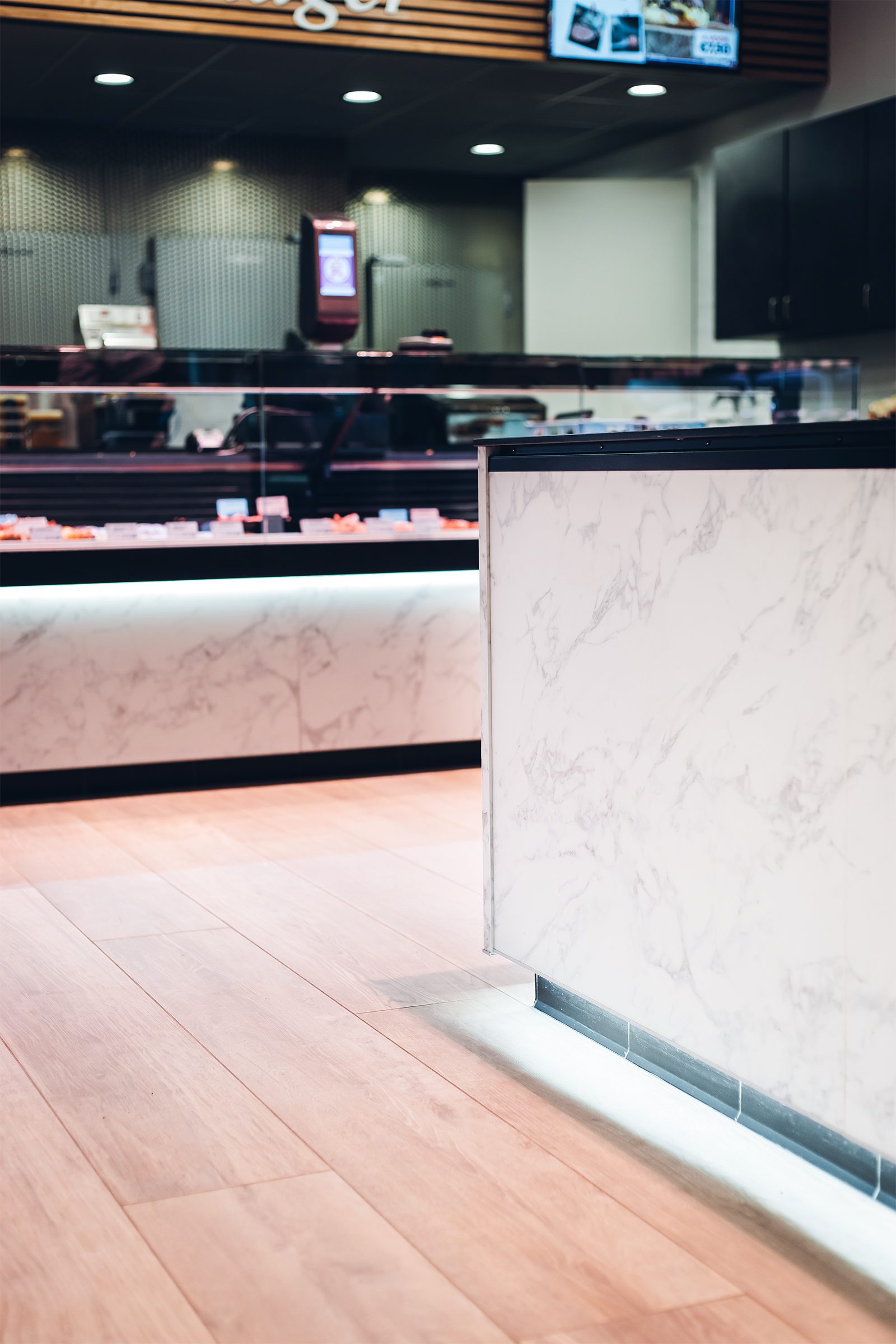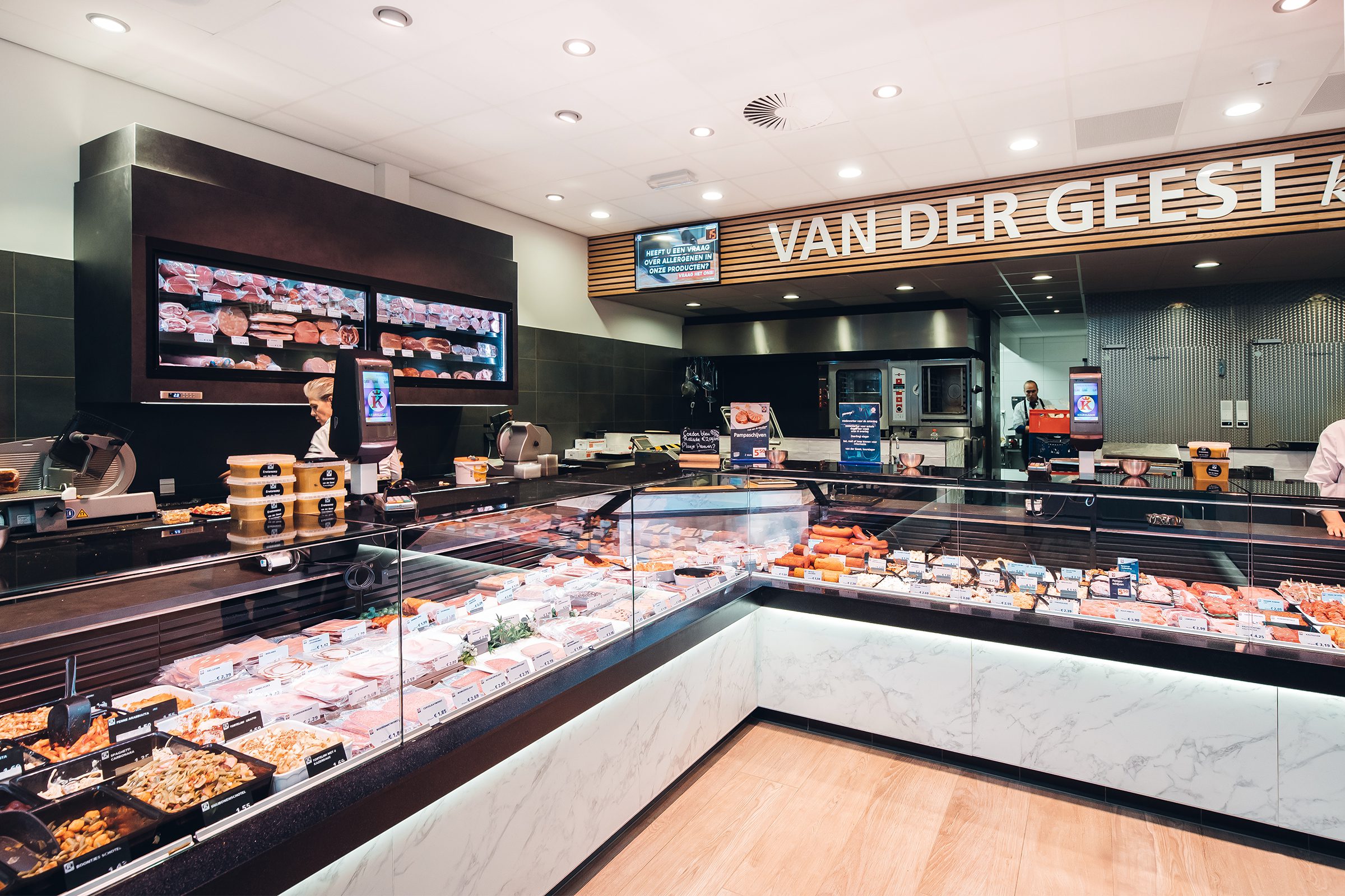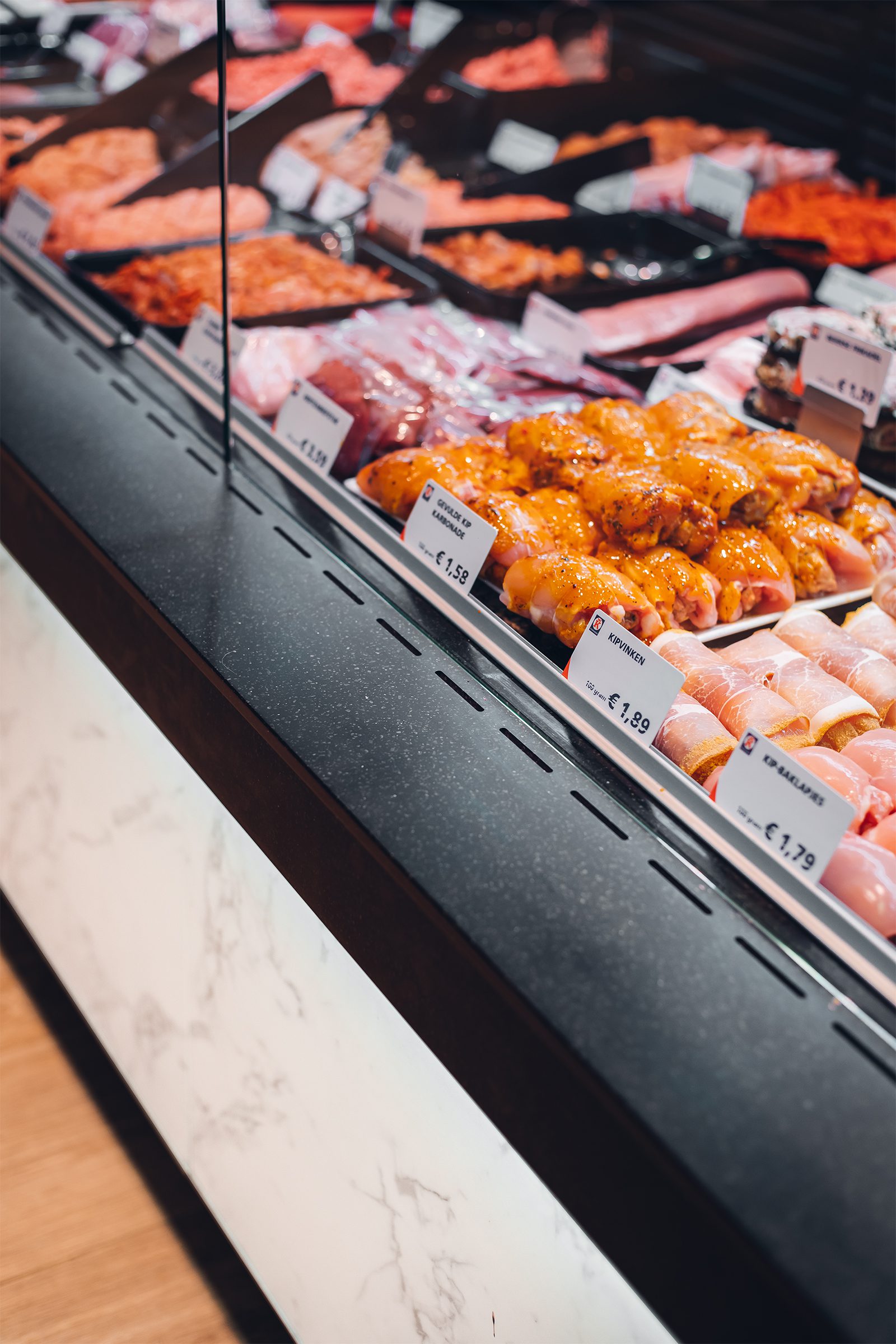 The new store of Keurslagerij van der Geest in Haarlem has a rather sleek design concept. The white marble look creates a luxurious look with an industrial vibe through the combination of wood and black tones.