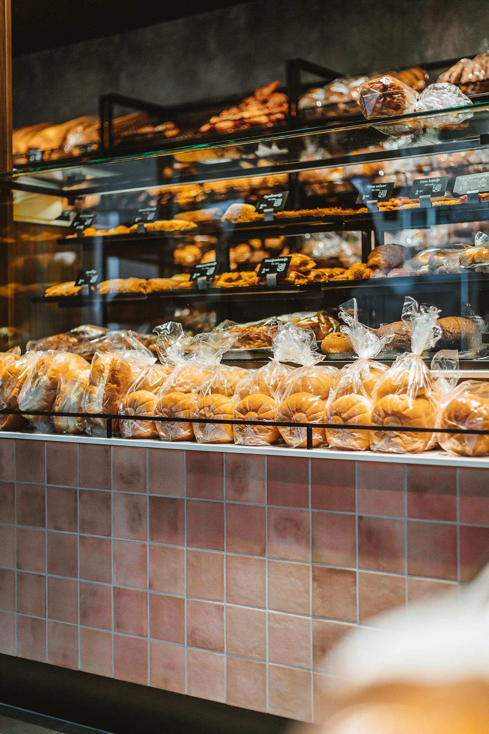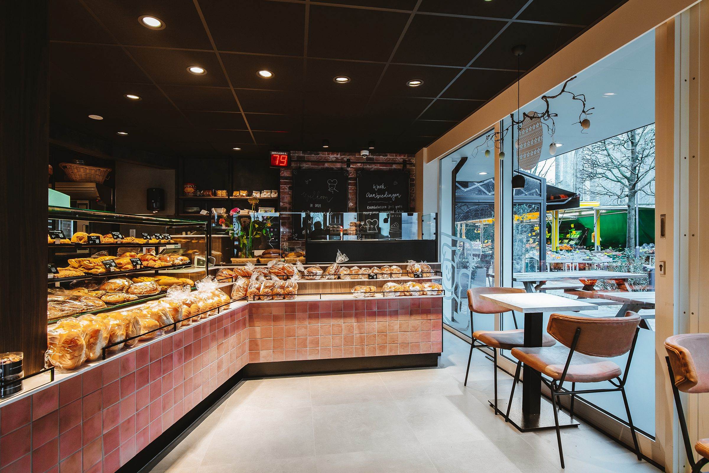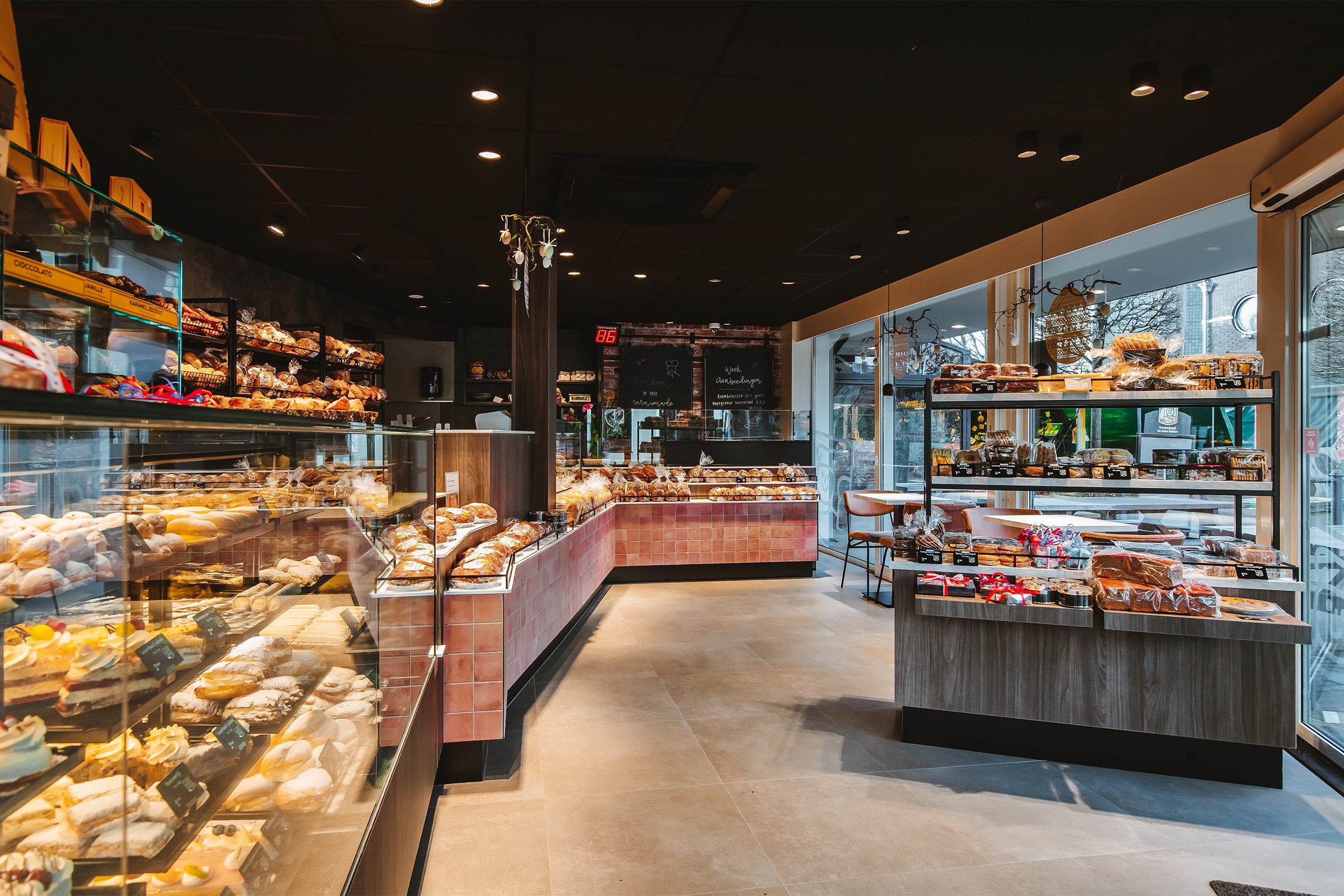Bij Vroonland, De Echte Bakker hebben wij gekozen voor een unieke aanpak in het ontwerp van de bakkerij. Een opvallend element is het gebruik van Kasba tegels op het front van de toonbank. Deze tegels zijn afkomstig van The Mosaic Factory. Het zorgt voor een organische look en feel die authentiek en elemantair is.