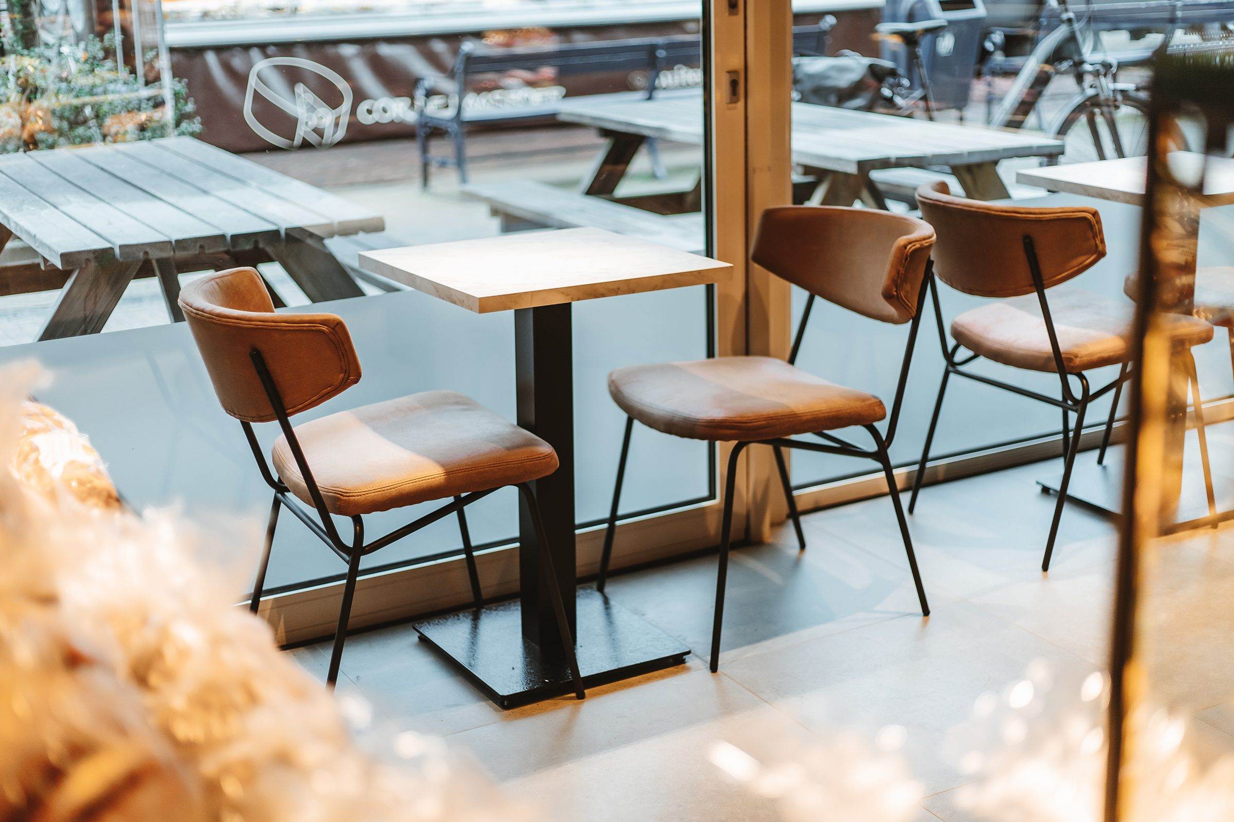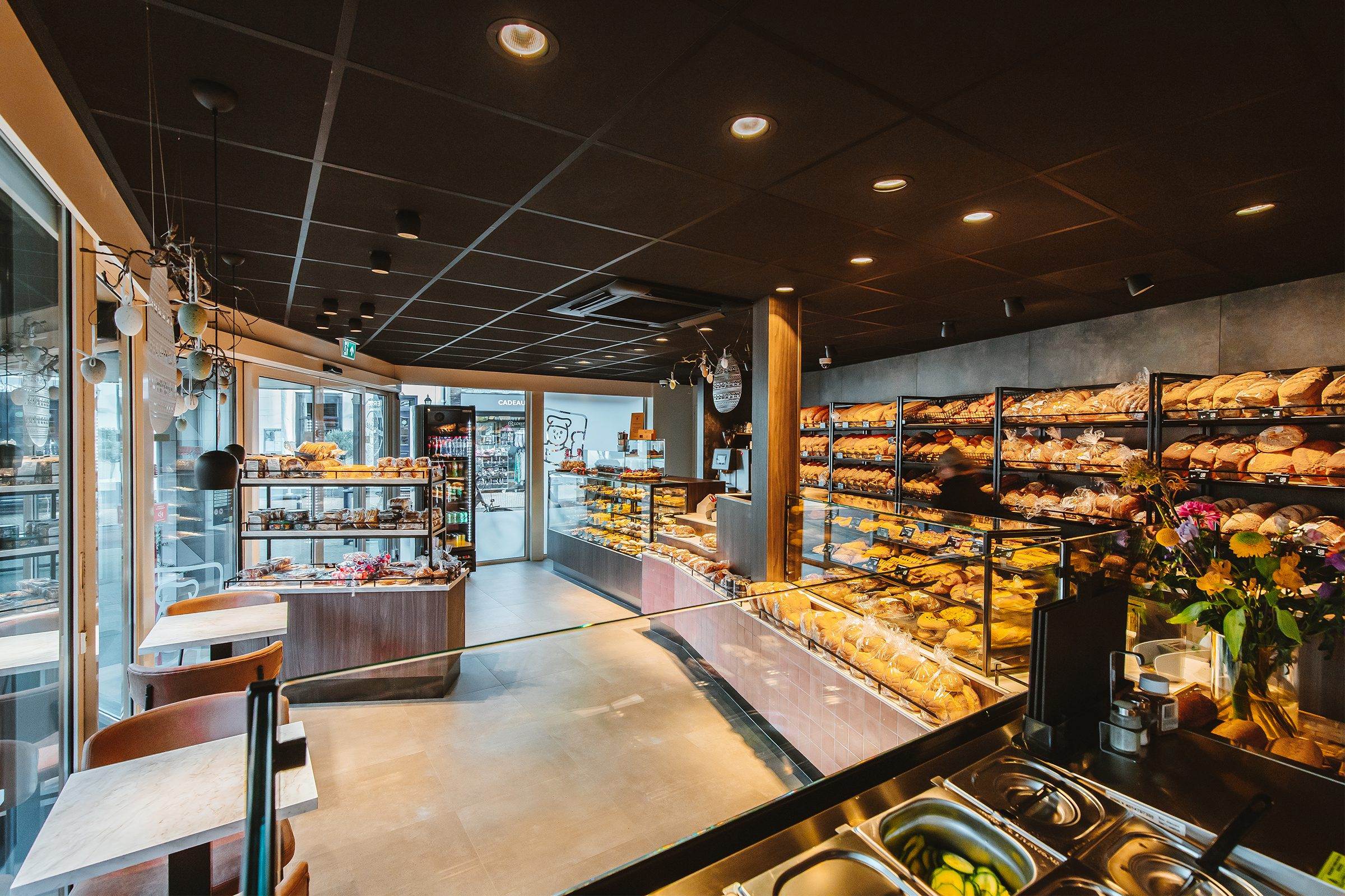 Wat betreft de wanden achter de broodrekken en het koffiemeubel, hebben we gekozen voor Resopal HPL-platen (blue steel 4915 RM), die niet alleen een robuuste uitstraling bieden, maar ook gemakkelijk te onderhouden zijn.