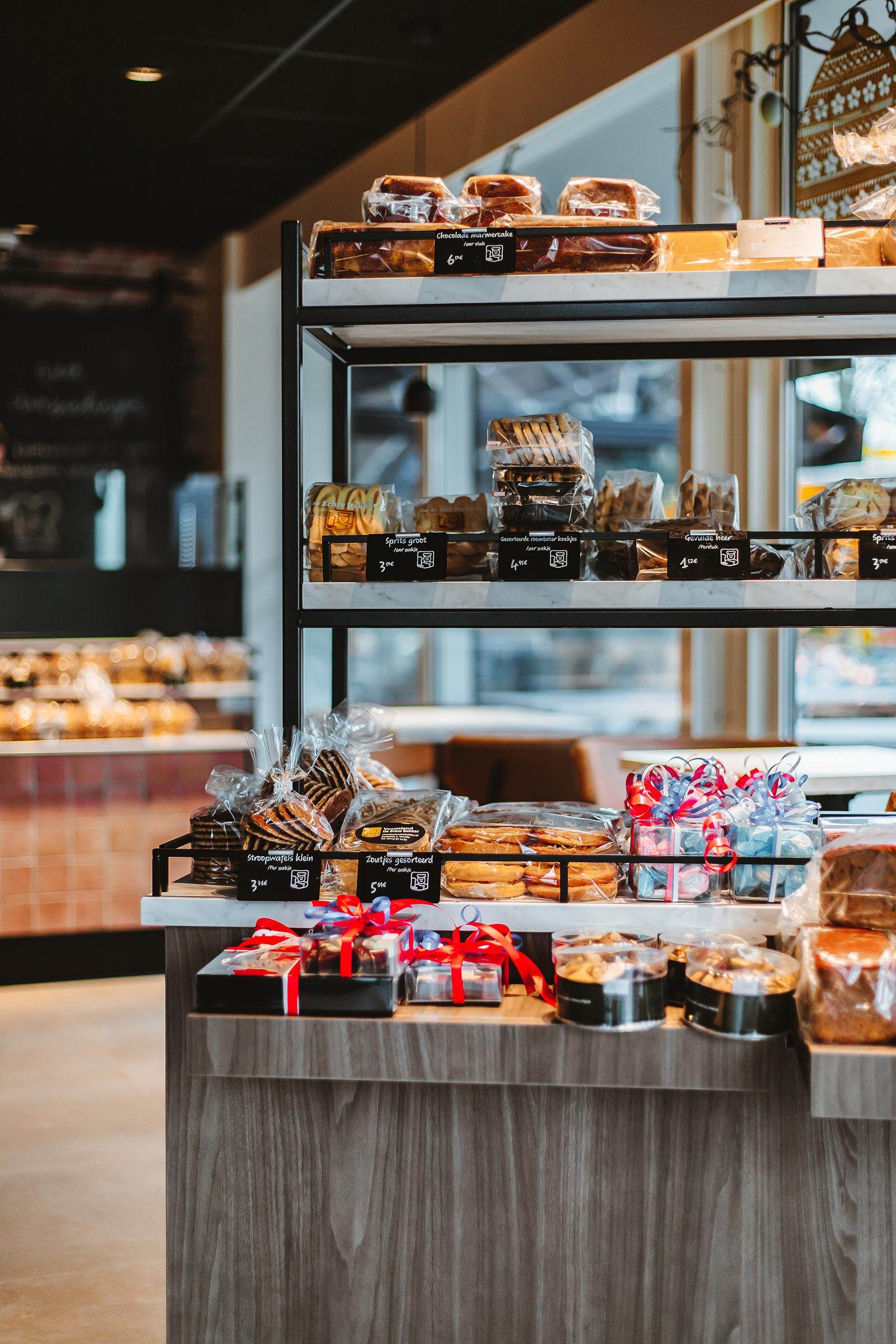 De combinatie van deze materialen en kleuren geeft de winkel een industriële uitstraling, terwijl tegelijkertijd een warme en uitnodigende sfeer wordt gecreëerd. De repeterende elementen zorgen voor een gevoel van eenheid en harmonie in de ruimte, wat de algehele ervaring van onze klanten versterkt.